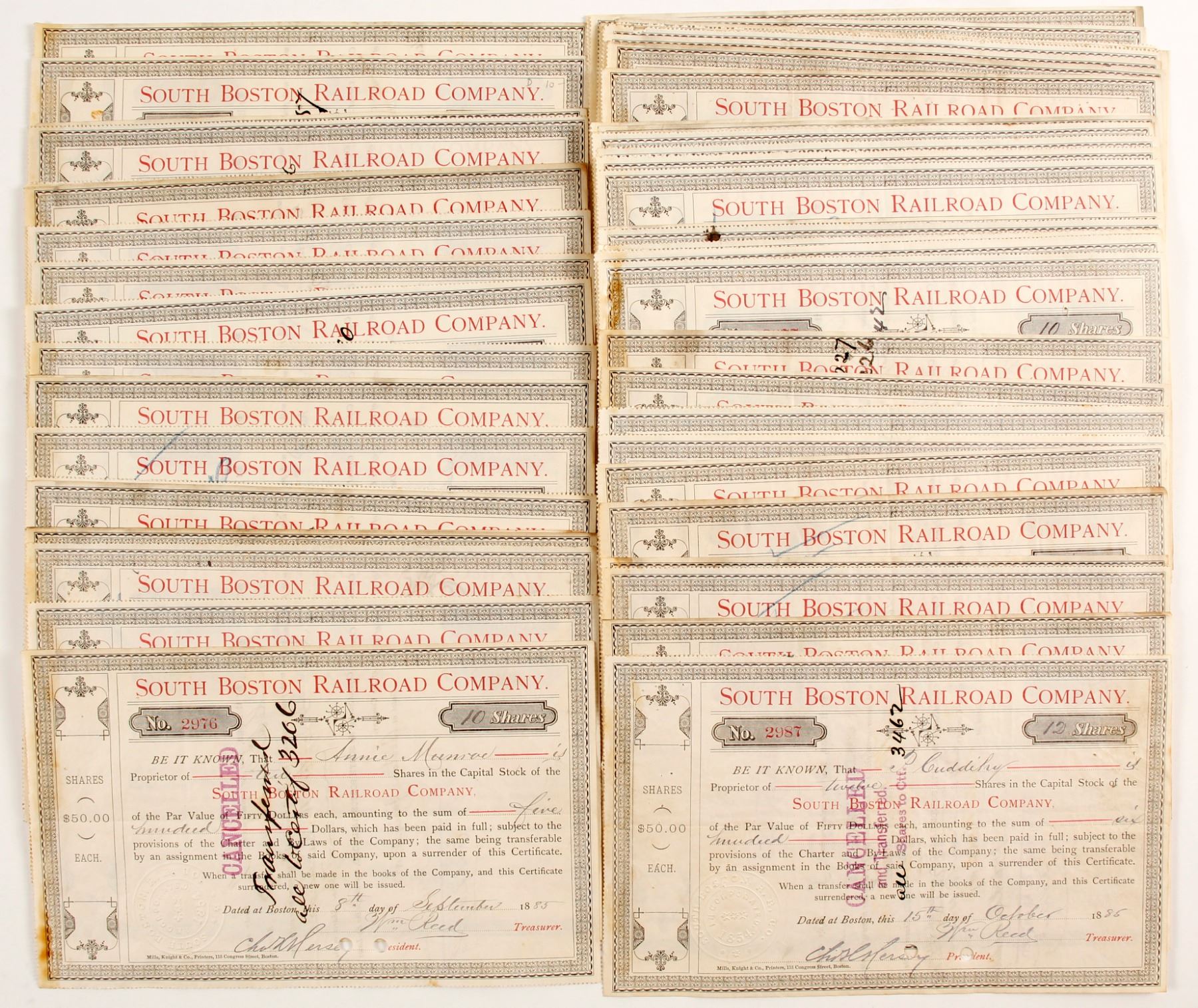 60 total certificates. All are signed and cancelled; all in good condition, some discoloration and fading. This historic document was printed by Mills, Knight and Company and has an ornate border around it. Title in red in two places, stamp frame in the left, lower corner. Prag Collection.
