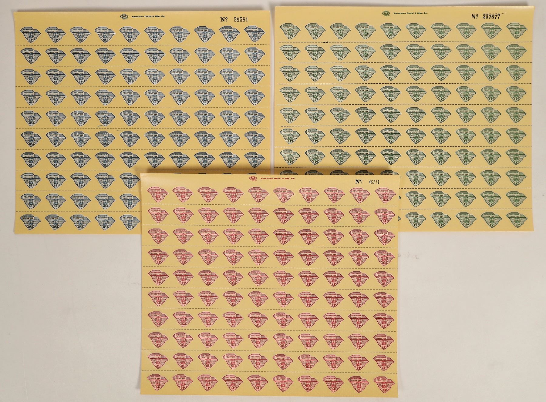 Lot of 3 different sheets with of 100 stamps each, 3 different denominations: 17 cent (green), 34 cent (red), and 68 cent (blue). Printed by American Decal & Mfg. Co.