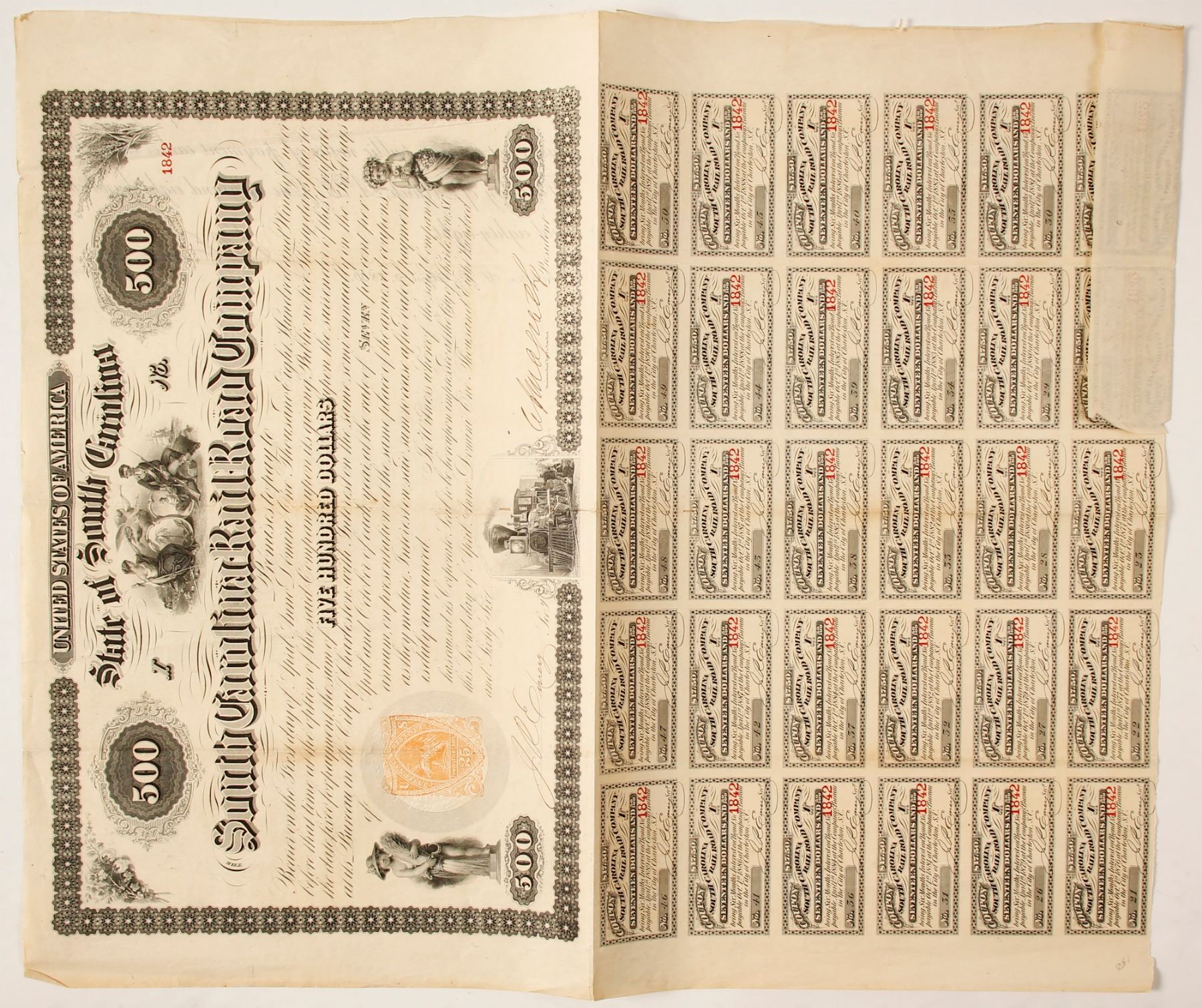 South Carolina Rail Road Company was a railroad company, that operated in South Carolina from 1843 to 1894, when it was succeeded by the Southern Railway. It was formed in 1844 by the merger of the South Carolina Canal and Rail Road Company into Louisville, Cincinnati and Charleston Railroad Company. Southern Railway (now Norfolk Southern Railway) gained control of the line in 1899 and consolidated it into the Southern Railway – Carolina Division on July 1, 1902 under special act of South Carolina, approved February 19, 1902. Printed: American Bank Note Co. New York. Ken Prag collection. State: City: Date: HWAC# 82279