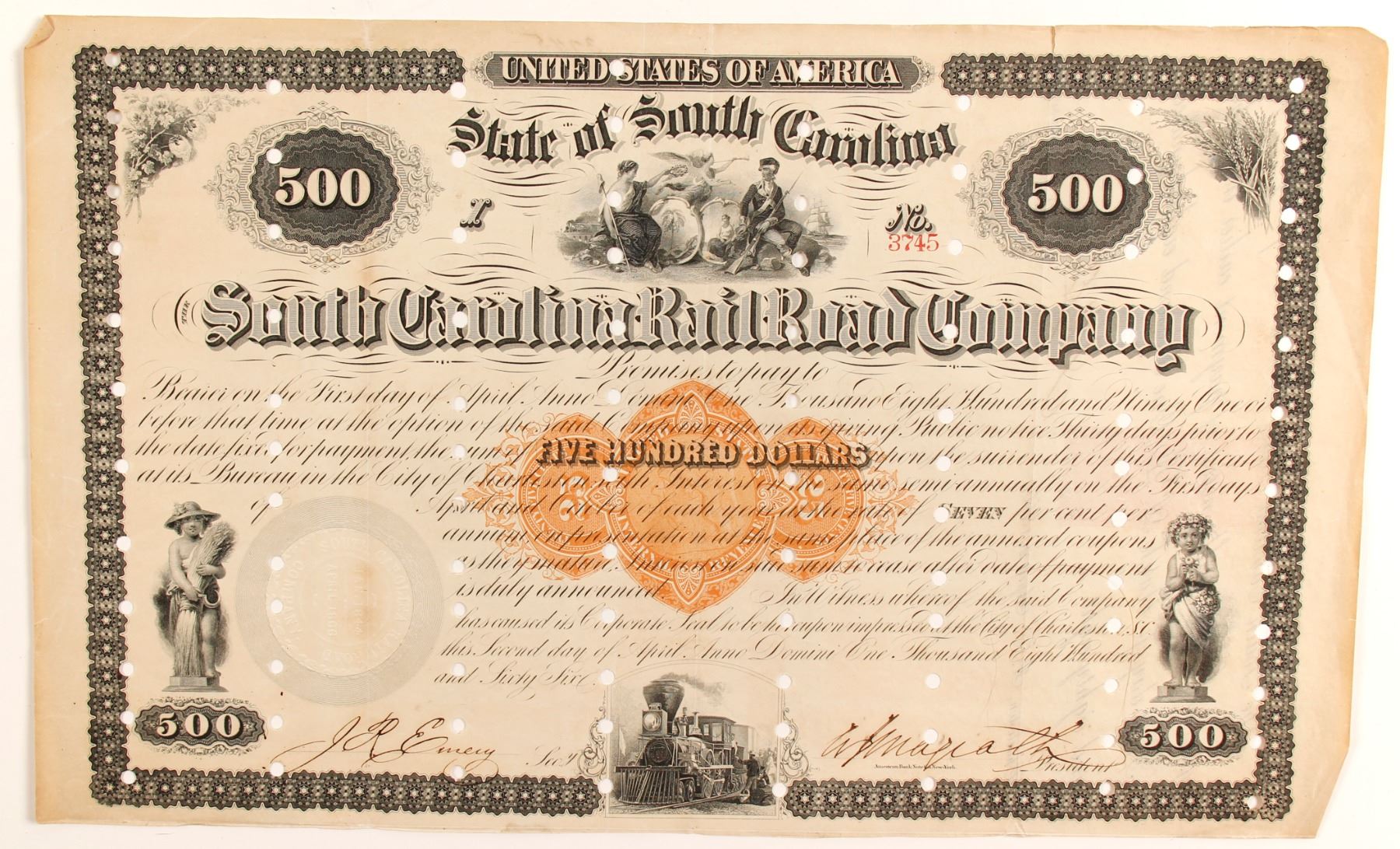 Cancelled $500 bond payable April 1, 1891, number 3745, raised company seal signed J. R. Emery, secretary. Imprinted Revenue stamp on front RNU1, back RNQ1.Four vignettes one train, two statutes, one with Lady Liberty and soldier. Gray border. South Carolina Rail Road Company was a railroad company, that operated in South Carolina from 1843 to 1894, when it was succeeded by the Southern Railway. It was formed in 1844 by the merger of the South Carolina Canal and Rail Road Company into Louisville, Cincinnati and Charleston Railroad Company. Southern Railway (now Norfolk Southern Railway) gained control of the line in 1899 and consolidated it into the Southern Railway – Carolina Division on July 1, 1902 under special act of South Carolina, approved February 19, 1902. (Wikipedia) . Printed: American Bank Note Co. New York. Ken Prag collection. State: City: Date: HWAC# 83724
