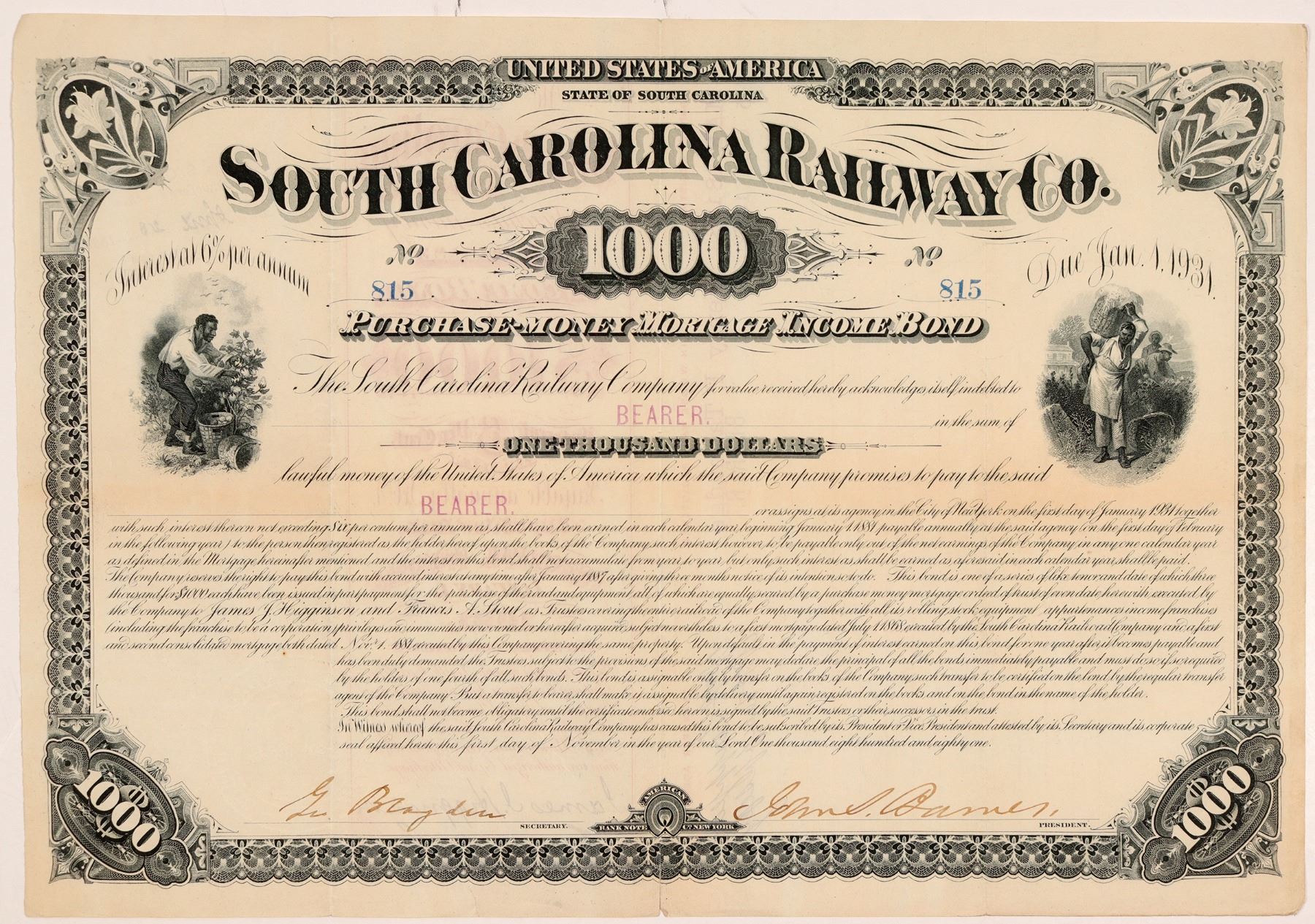 #815, I/U, $1000, 6%, 50 yr. Purchase Money Mortgage Income Bond bearer bond. Issued Nov. 1, 1881. Signed Samuel Bamer President. BLACK, embossed seal w/palm tree center. American Bank Note Co. VF. Ken Prag Collection