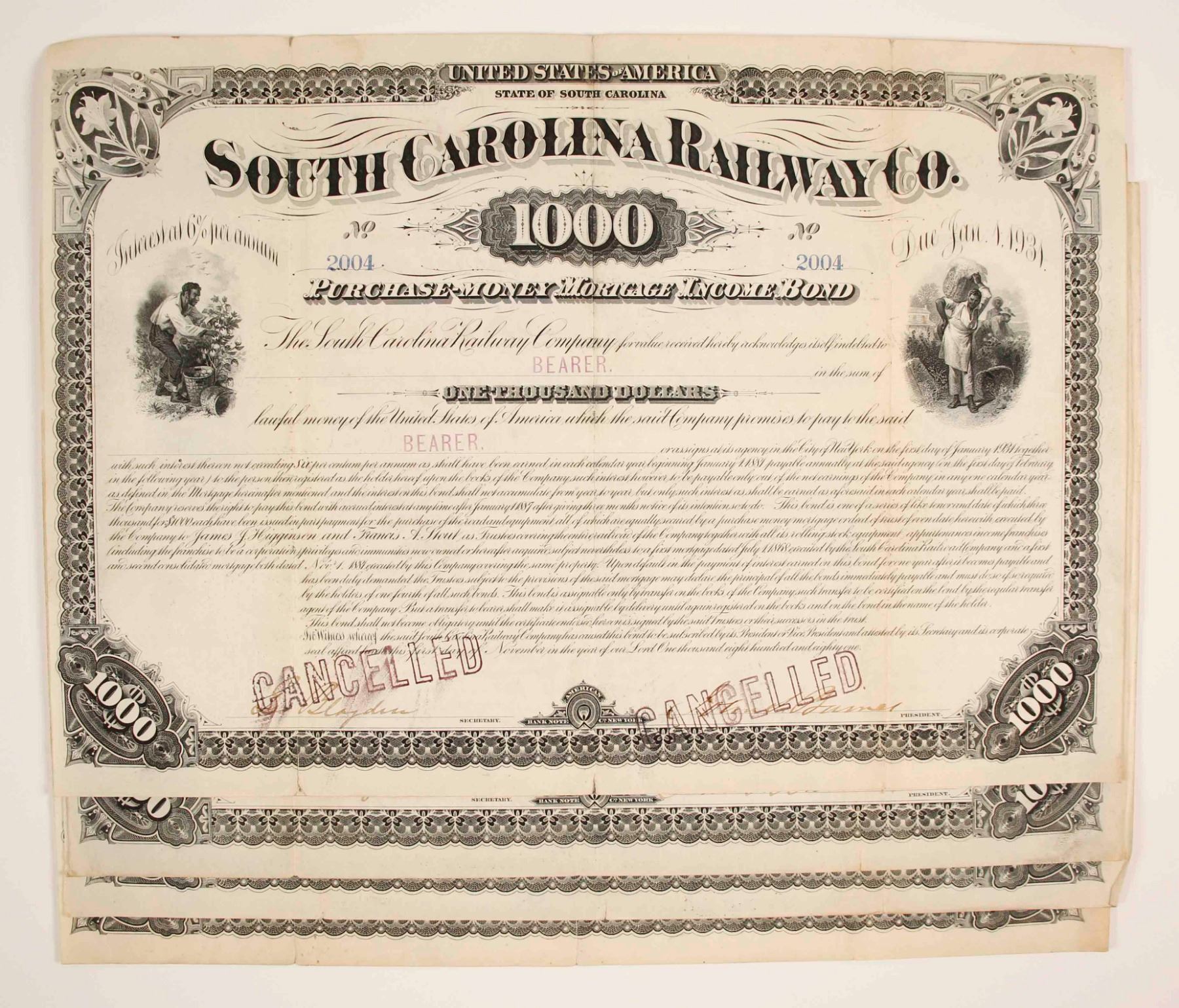 4 total bond certificates. All with vignettes of slaves picking cotton and hauling bushels of cotton. All in good condition, some wear and tear. All i/c.