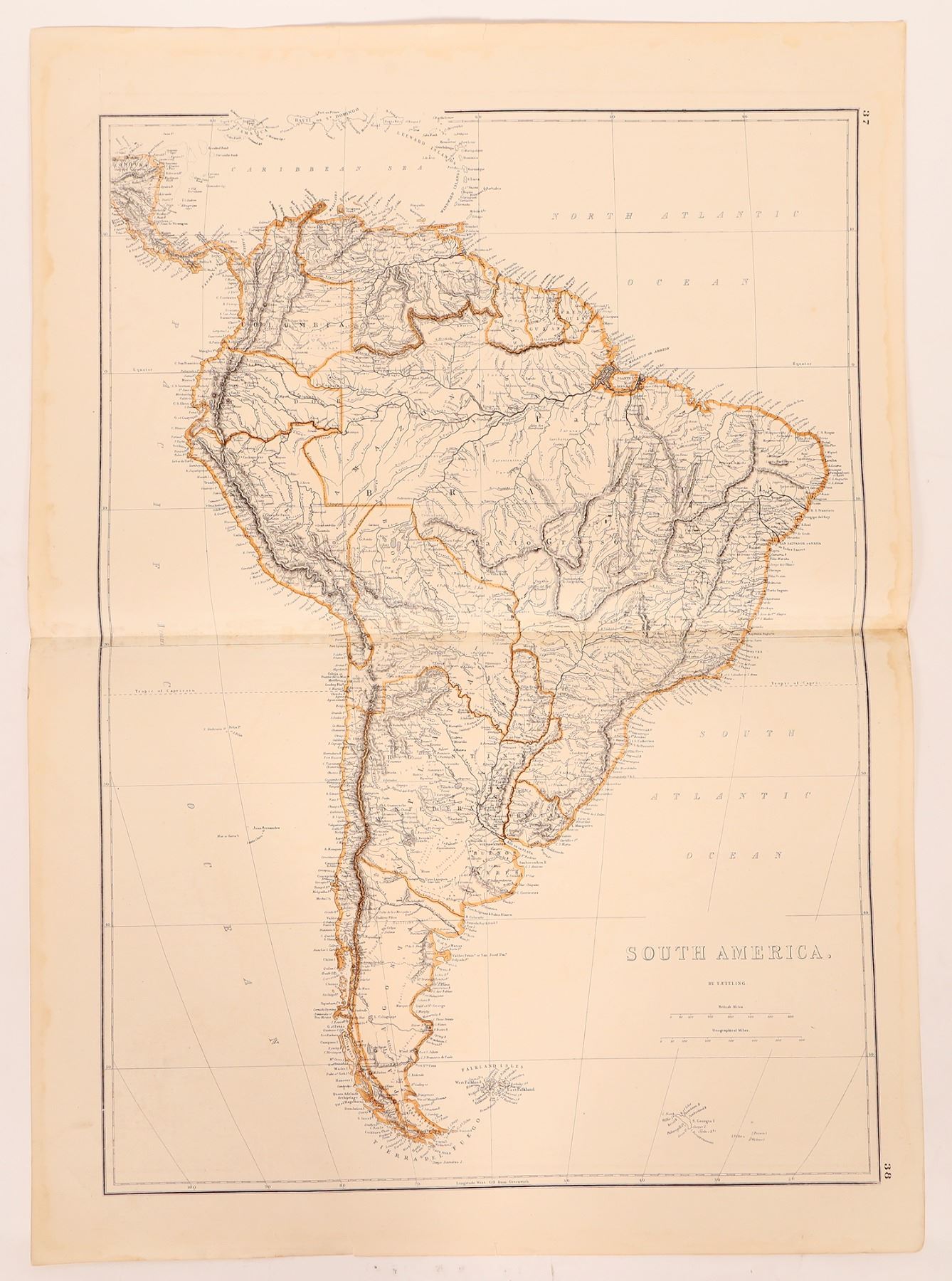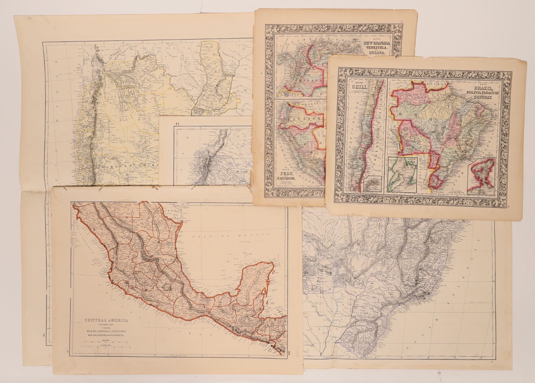 (4) Maps from an atlas: South America by T. Ettling c. 1850., Southern States of South America; Brazil, Bolivia, Peru, Ecuador by J. W. Lowry c. 1860; double sided map of Central America. About 27.5 x 19.5 inches.