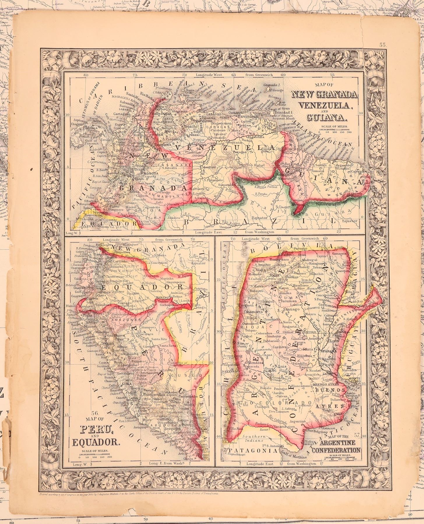 Collection of (6) maps of South and Central America. (2) Published by S. August Mitchell Jr., Venezuela, Guiana, Peru; Ecuador, "Chili", Brazil, Bolivia, Paraguay, Uruguay, with intricate floral border. c. 1860, 15.25 x 12.5 inches. _x000D_
