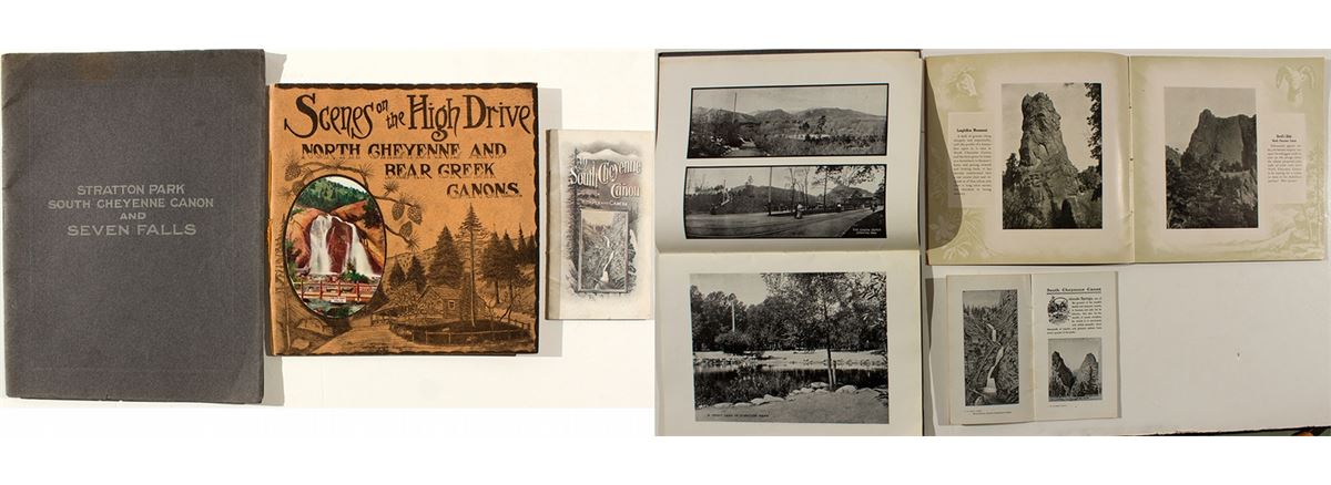 Lot of three. 1) "Stratton Park, South Cheyenne Canon, and Seven Falls" A little history and lots of photographs. One two page photo of Seven Falls and one three page fold out photo of the cliffs in South Canon. 12 x 9". 38 pages. 2) "Scenes of the High Drive, North Cheyenne and Bear Creek Canons." H. H. Tammen Curio Company publishers. Photographic album. 30 pages. 9 x 9 1/2". 3) 24 pages. Mostly photographs. 4 x 6 3/4".