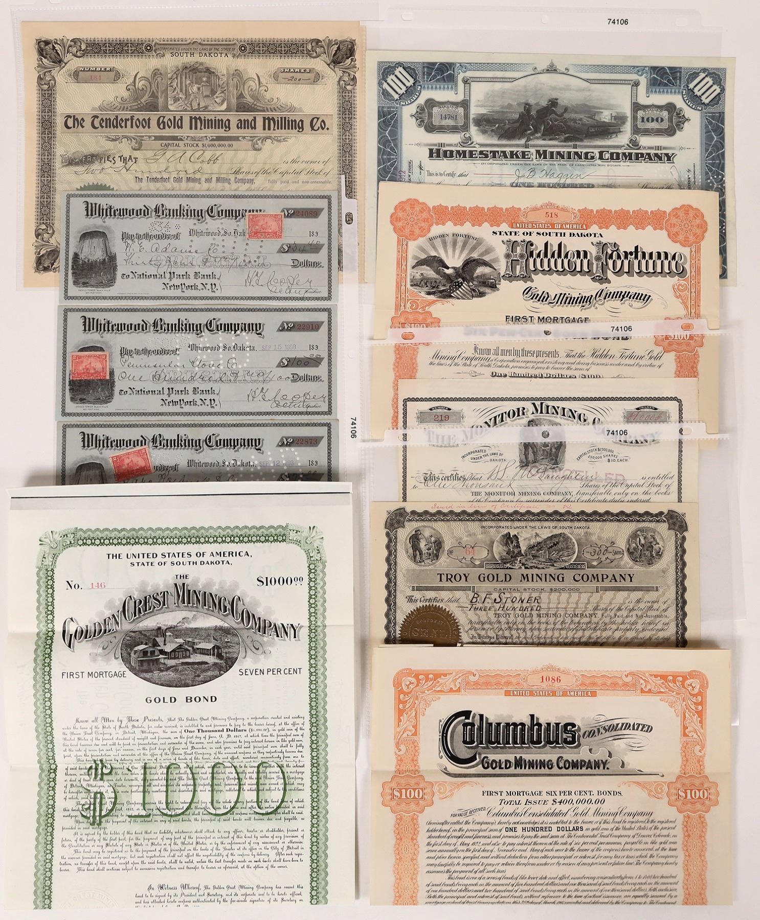 Lot of eight. 1) Tenderfoot Gold Mining & Milling, 1903. Unusual dateline of Lake Presto! 2) Monitor Mining, 1892. Eureka vignette. Signed by president and issued to DM Laughlin. Datelined Deadwood. 3) Troy Gold, 1906. 4) Homestake Mining, 1912. Stamped JB Haggin on reverse, He was one of the 3 original founders. 5) Columbus Gold Bond, 1907. Located near the Homestake mine in the Black Hills. 6) Golden Crest Bond, Coupons 6-20 attached. Owned 256 acres in the divide between Two Bit Gulch and Strawberry Gulch. 7) Hidden Fortune Gold, 1904. Nine coupons attached. Mines located near Lead. 8) Three Whitewood Banking Company checks with a Devil's Tower, Black Hills vignette. Very nice!
