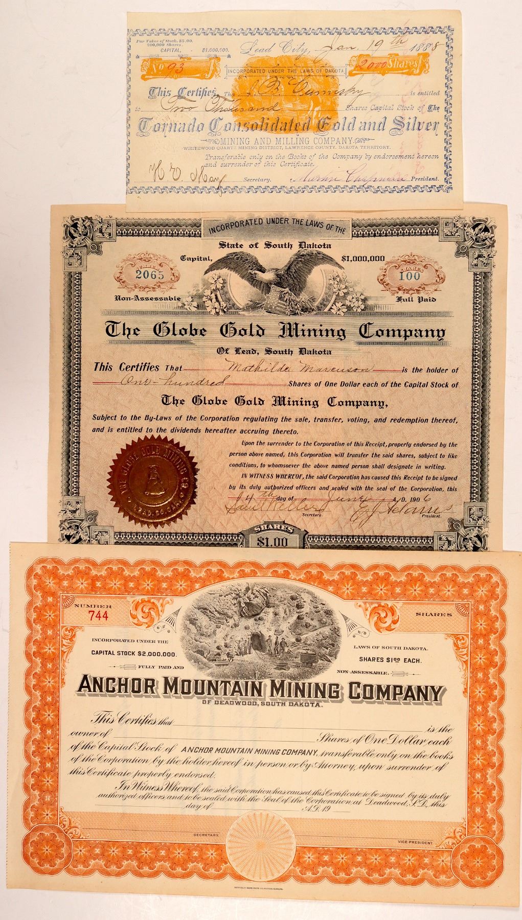 Globe Gold Mining Company I/U No. 2065 for 100 shares to Mathilda Mareuson signed by E.J. Helmans(?), slight tears in for (4) approx. .5" to 1" at crease, please inspect; Tornado Consolidated Gold and Silver Mining and Milling Company I/U from Lead City, 1888, No. 93 for 1000 shares to J. B. Cumisky signed by President Martin Chapman; Archor Mountain Mining Company of Deadwood South Dakota Unissued. #744.
