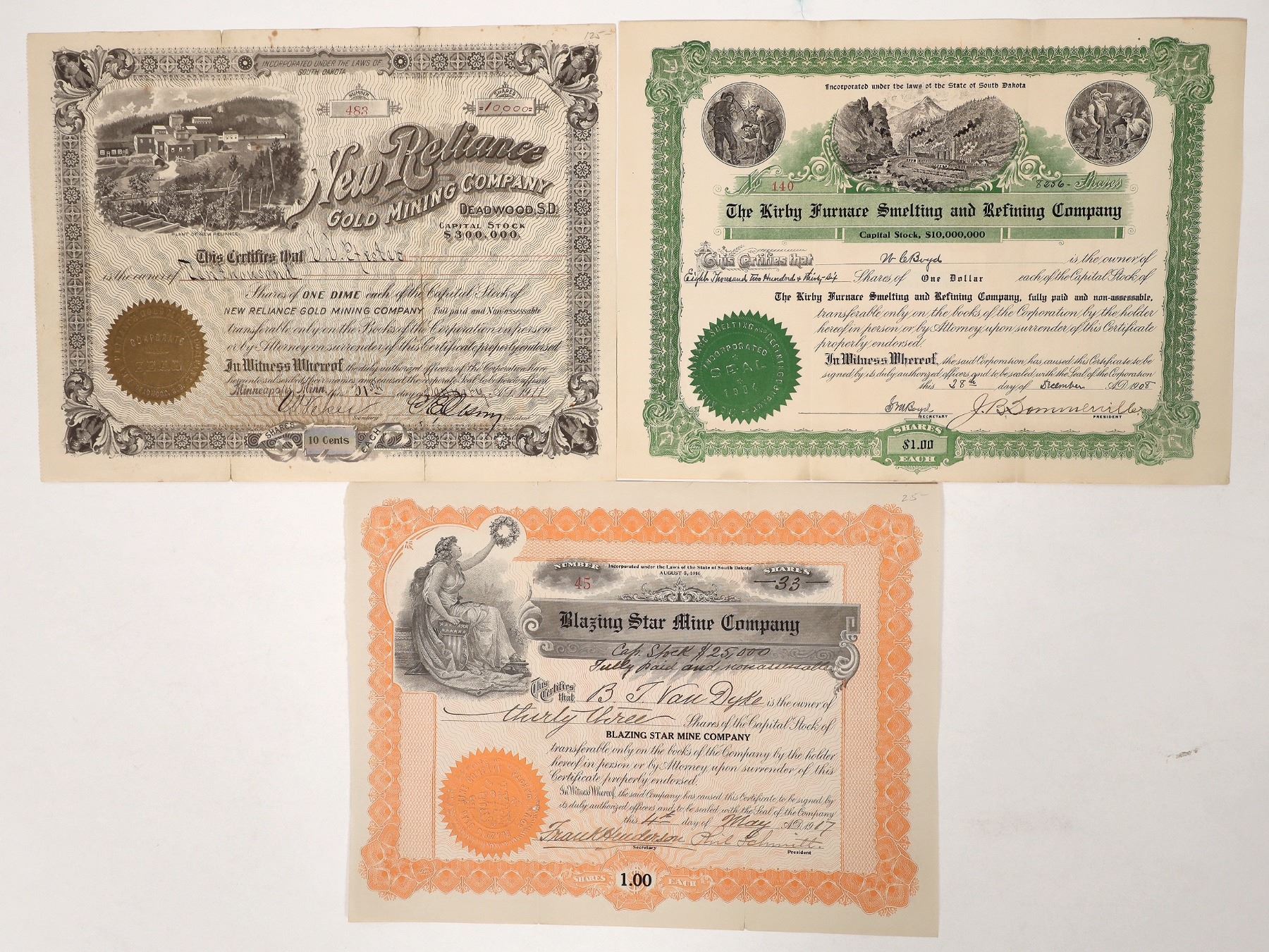 Issued-1908 Kirby Furnace Smelting and Refining, 1917 Blazing Star Mine, 1911 New Reliance Gold-small stains.