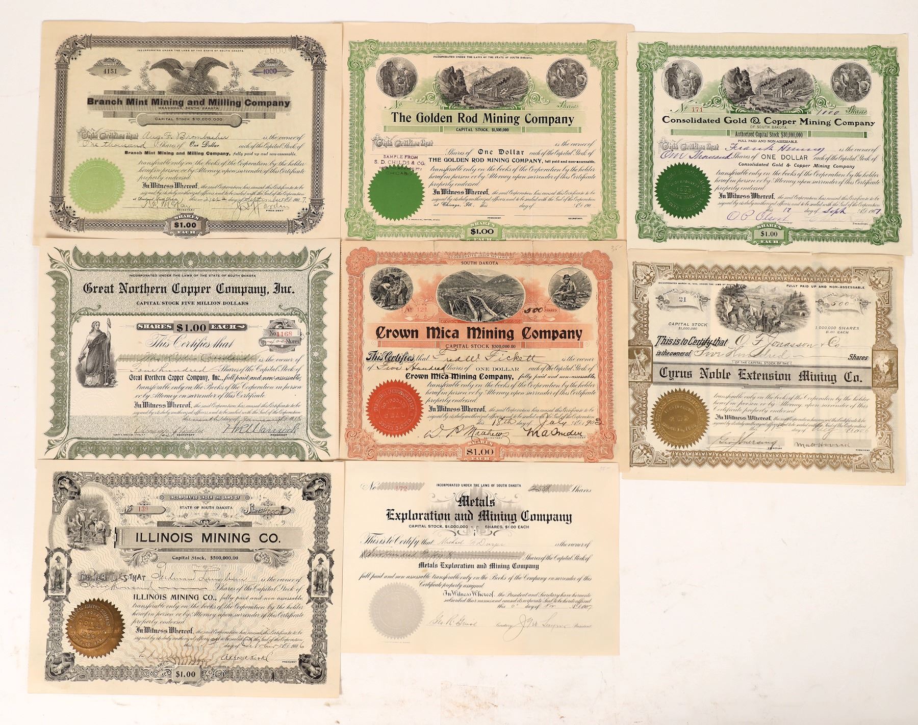 8 South Dakota Mining Stocks. Metals Exploration and Mining, Illinois Mining, Great Northern Copper, Crown Mica, Cyrus Noble Extension, Cons. Gold and Copper, Branch Mint, Golden Rod. South Dakota