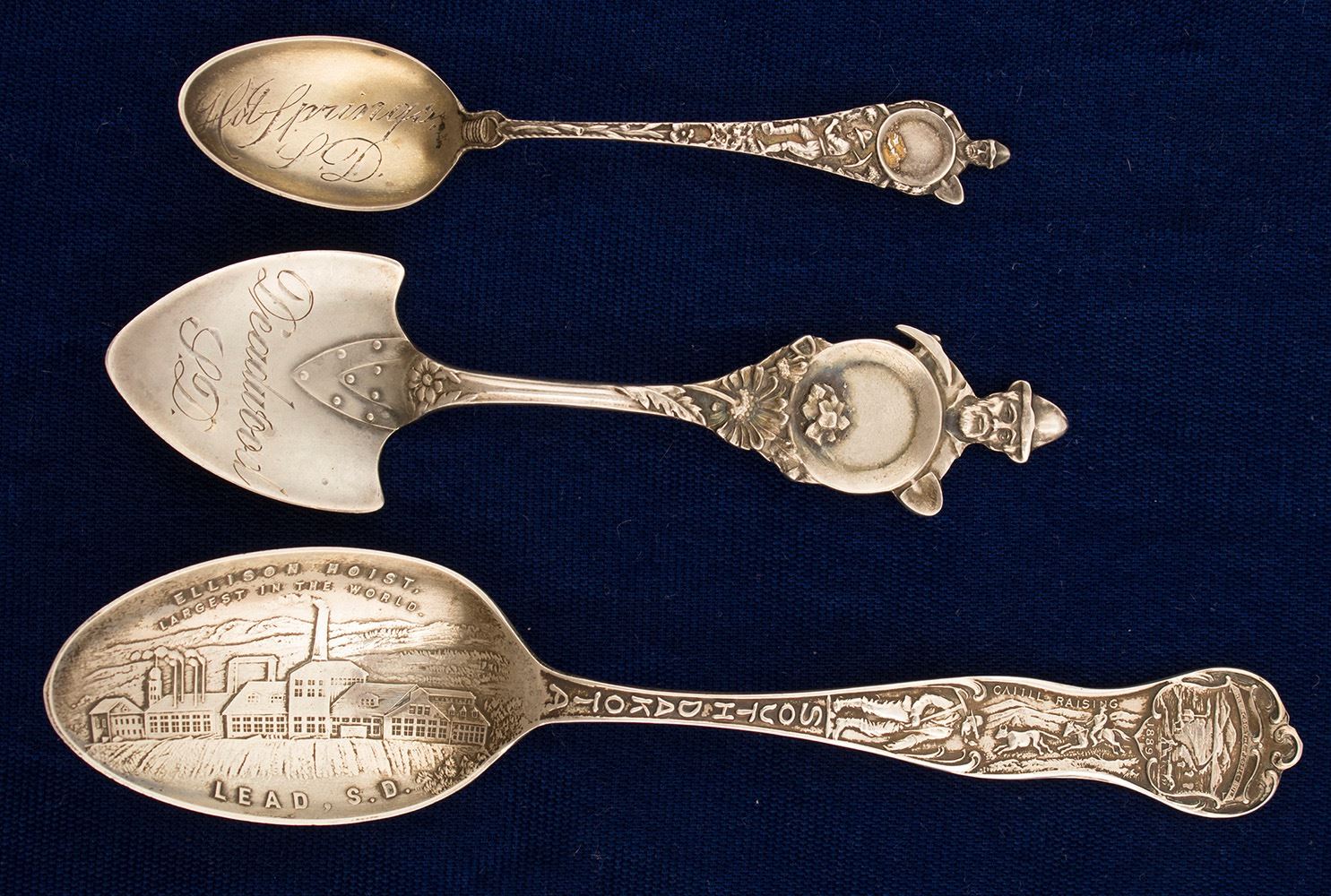 The silver spoons are from Deadwood, Hot Springs, and Lead So. Dakota. 1 spoon engraved with "Ellison Hoist, Largest in the World." 1 delicate spoon (3.5") reads Hot Springs S.D. (slight patina). 1 spoon is the the shape of a shovel. Date: Location: South Dakota HWAC# 56703