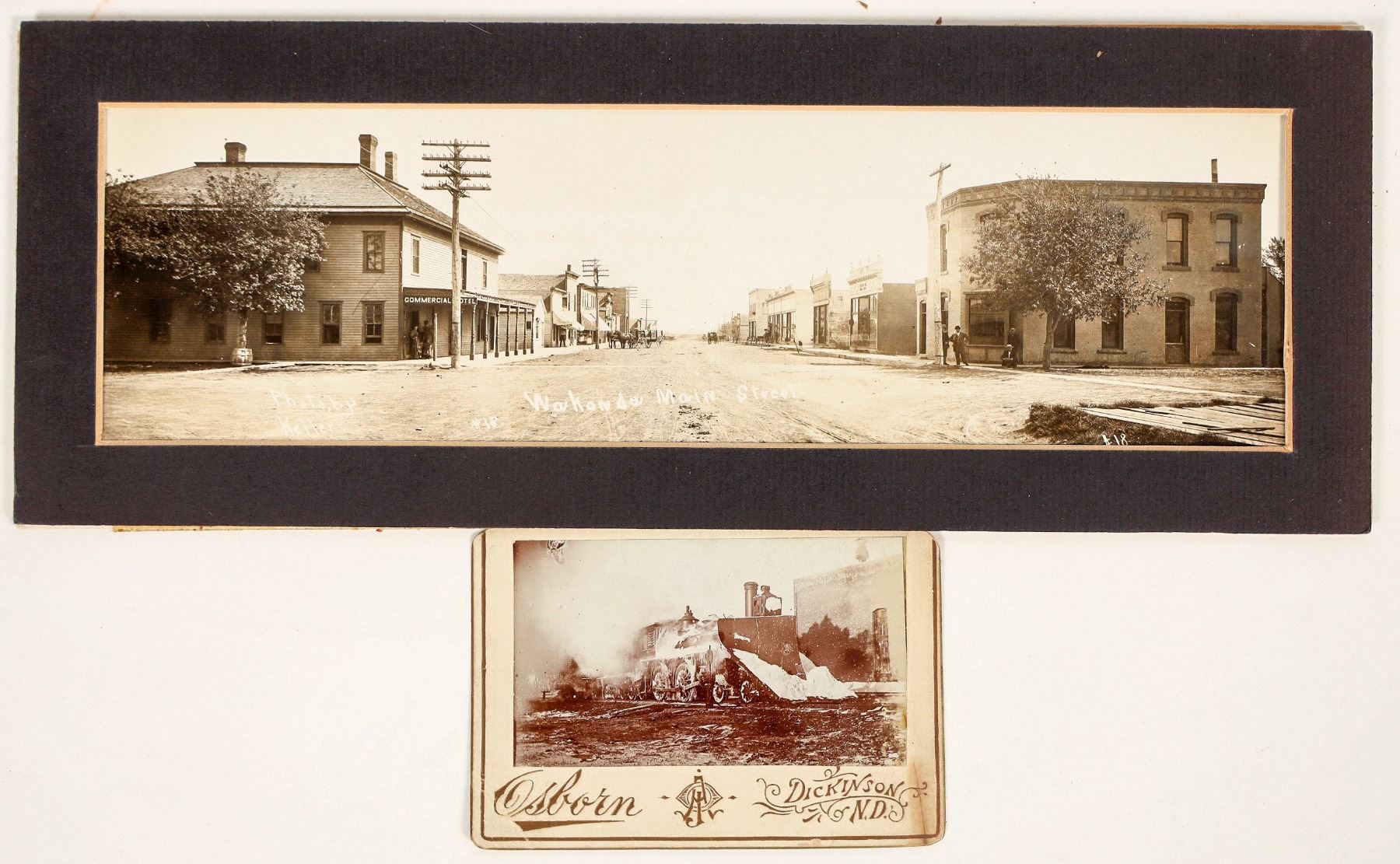 Lot of 2 Dakotas pictures. 1) A c.1890s small photo of a Northern Pacific locomotive snow plow. Photo by Osborn of Dickinson, North Dakota. Pencil writing on reverse. 3 x 4" 2) Matted panoramic real photo postcard showing Wakonda, South Dakota Main Street scene. Wagons, but no vehicles in view. Early 1900s shot by photographer Keller. 4.5 x 12"