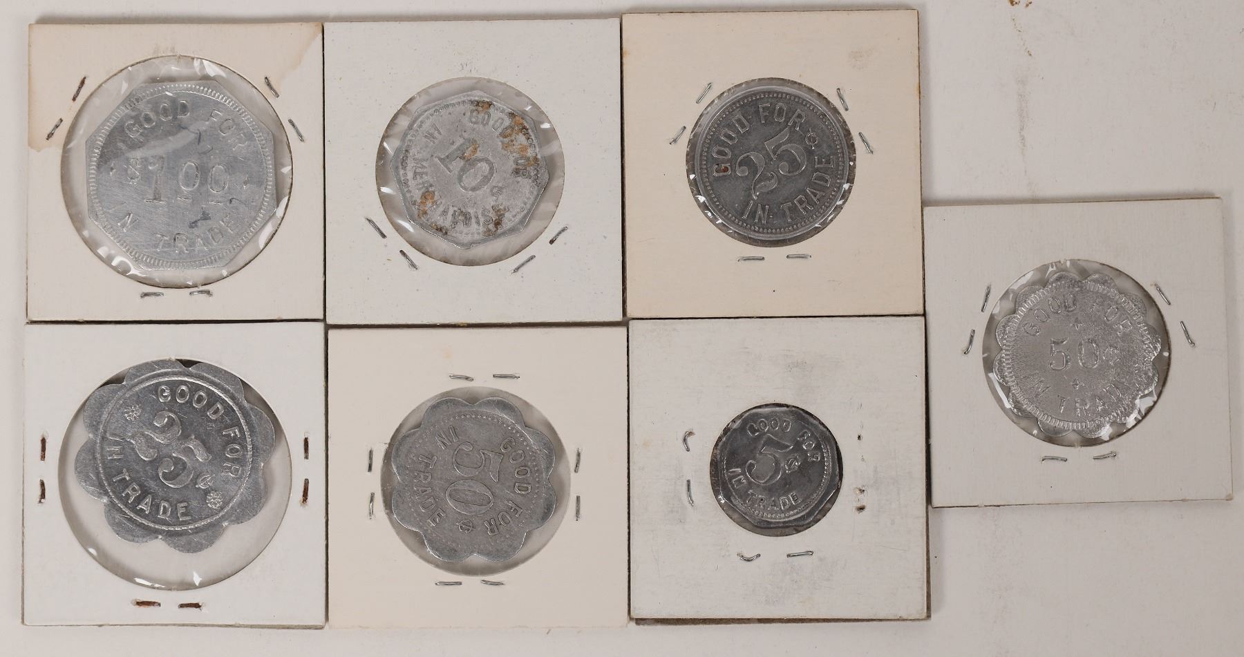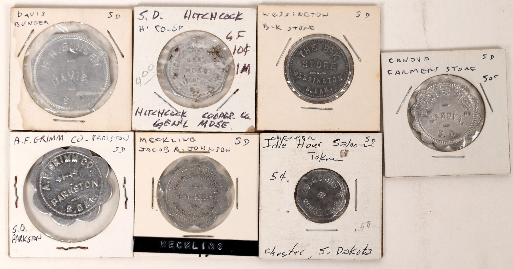 Lot of seven South Dakota tokens: Idle Hour, Chester; Hitchcock Cooper Co., Hitchcock; Farmers Store, Canova; B. H. Bunger, Davis; The B-K Store, Wessington; Jacob A. Johnson, Meckling; A. F. Grimm Co., Parkston. South Dakota