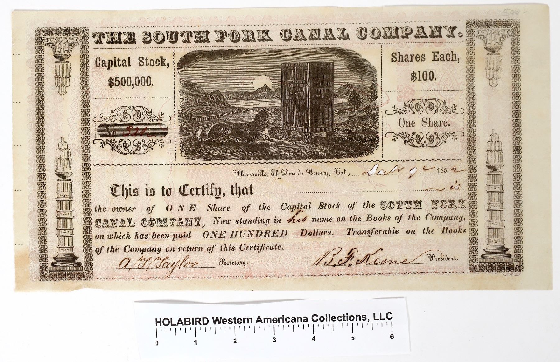 The company was formed on July 10, 1852 to bring water to the mines in Placerville from the South Fork of the American River. The soil wasn't suitable for a canal so a wooden flume was built four feet wide and three and one half feet deep. The joints were covered with canvas. The flume went from the South Fork of the American River, at the foot of Randolf Canyon, to Long Canyon, then to Reservoir Hill. The flume had a grade of 4 feet per mile. It took from 1853 until 1854 to complete the first 25 miles of flume. Ultimately the company had more than 34 miles of ditch, and 108 miles of lateral channel. These ditches were critically important to placer and hydraulic mining. Keene was a politician in the Mother Lode region. Taylor was a clerk for the 2nd US Marshal for the southern district. He was a California pioneer and a historian. (Bancroft, Browne). This is one of the few early California gold rush companies floated in San Francisco during the early part of the Gold Rush. Mining expanded west along the South Fork American River, and prior to 1852 the Natoma Ditch system began in the Salmon Falls area (now under Folsom Lake). This extensive system supplied mining camps east and south of Folsom as well as the rapidly developing vineyards. It also expanded the South Fork Canal, taking water at this time from upper Weber Creek on the Placerville Divide. The South Fork Canal systems extended from its Weber Creek diversion 5 miles below Brockless Bridge on the American River to a reservoir in Placerville. From here, water was distributed in several directions by laterals and other canals or ditches. It ultimately conveyed water close to Shingle Springs. Placerville California 1852