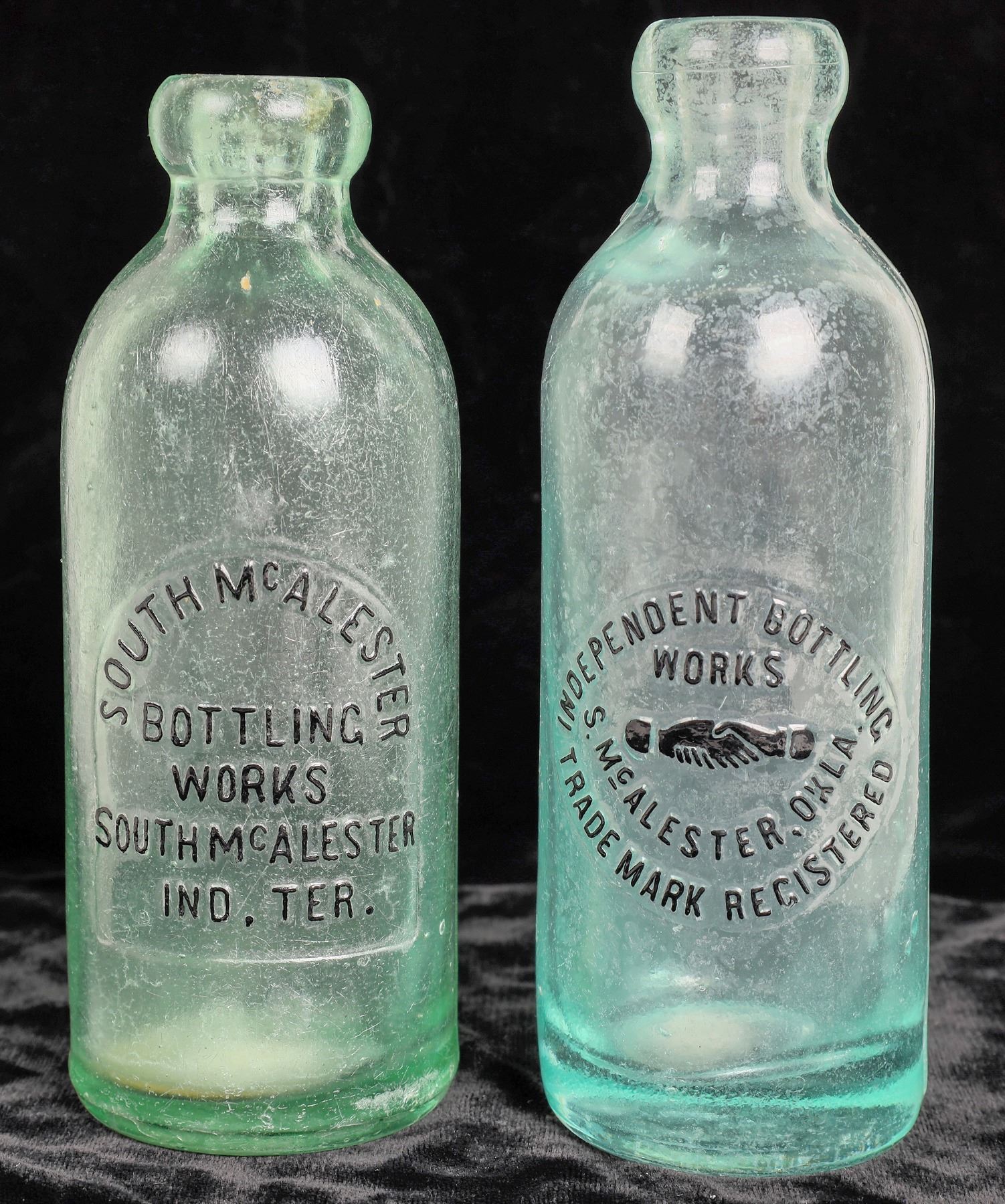 2 black embossed bottles. South McAlester Bottling Works, Ind. Ter. Independent Bottling Works with embossed handshake with base bruise. South McAlester Indian Territory