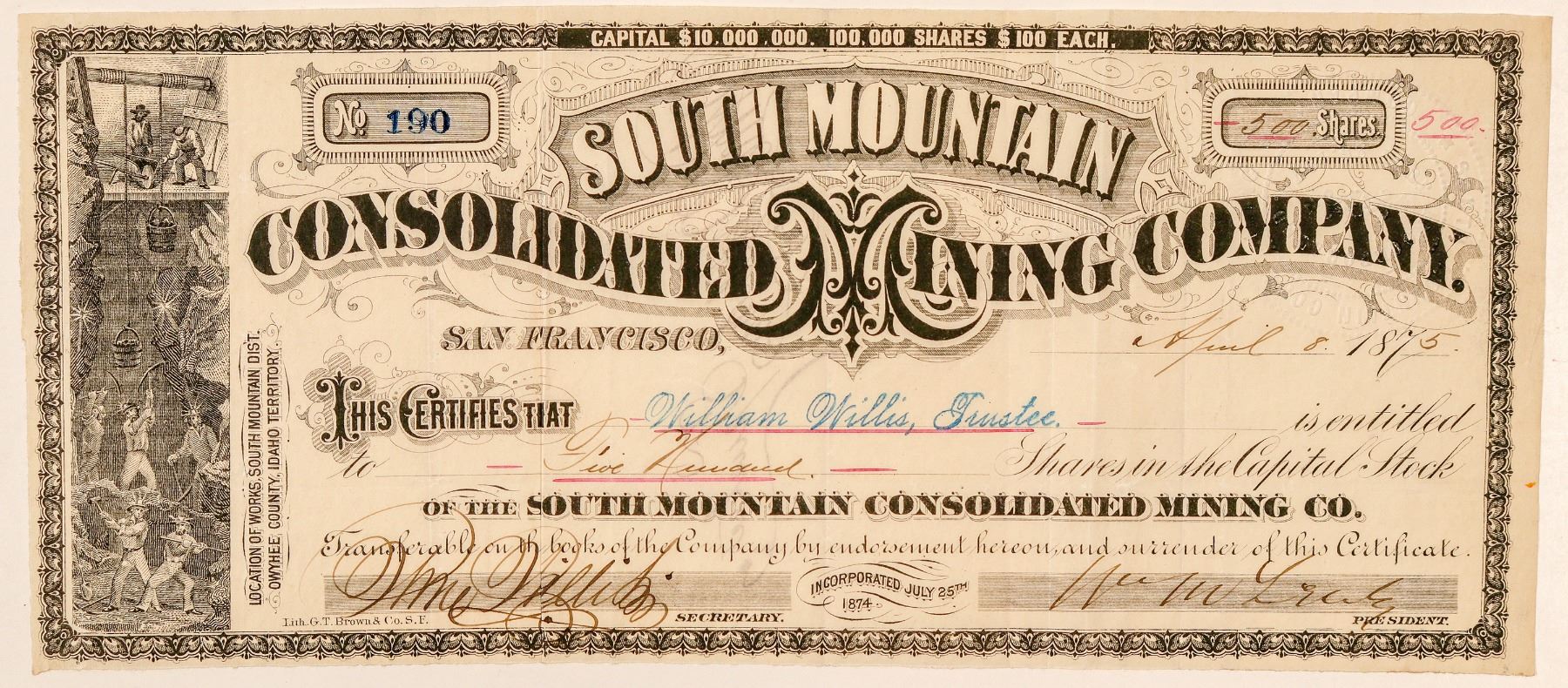 Extra rare and a GT Brown lith. Location of Works: South Mountain District, Owyhee County, Idaho Territory (printed to the right of the vignette). Inc. 1874. No. 190, issued for 500 shares to company secretary William Willis on April 8, 1875 in San Francisco. Also signed by the president (illegible). Not cancelled. Black border and print. Fancy company logo and vignette of mine hoisting scene. Printed by noted African-American lithographer G.T. Brown. Many folds, some creases. 4 x 9.25" According to Raymond (1877), the failure of this company "brought operations in that camp to a dead stand-still" (pg. 203). He reports the whole South Mountain is a "dead camp", having not escaped "the financial crisis which so seriously crippled mining activities in Silver City..." "With the company, the whole camp went down..." (pg. 227). It's failure was tied to many things: the failure of the Bank of California and the resulting panic that had on stockholders; the company's large expenditures; and the miners going on strike until they were paid. The camp had 800 people at its peak. Located 26 miles south of Silver City. [See Raymond, 1877, pgs. 227-229] Ken Prag Collection