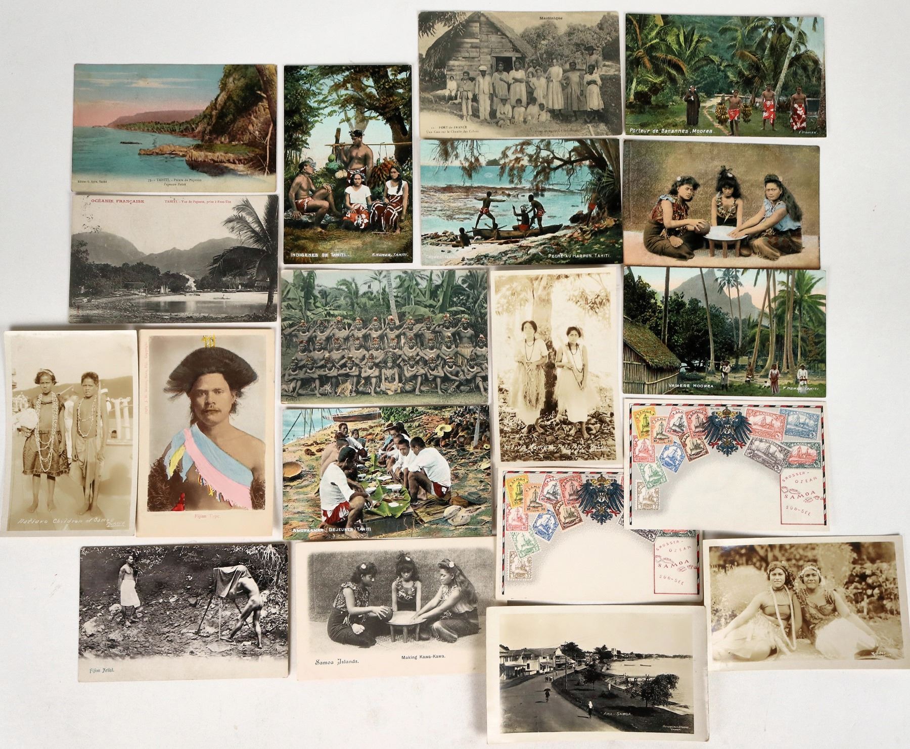 18 postcards from Fiji & Samoa etc. with 5 RPC's. Natives, colorful stamp collages, Tahiti, Papenoo Point etc.[ South Pacific