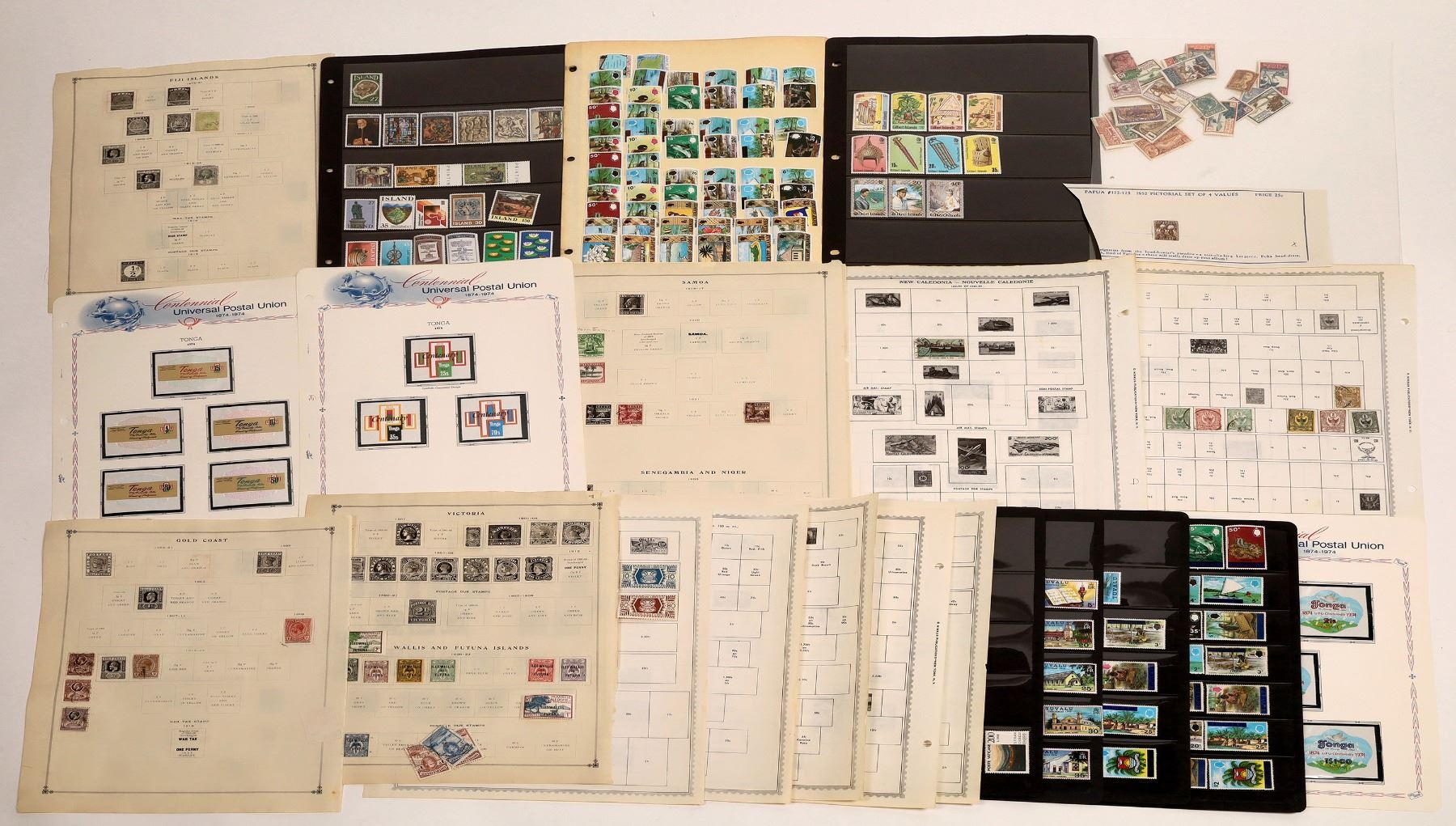 A collection of varying stamp pages from several books, includes modern as well as pre WWII. Fiji Islands: 2 Island: less than 15. Gilbert Islands: about 50. New Guinea: 1 New Calédonie: about 40 Samoa: less than 10 Tonga: 3 modern stamp sheets 1970s Tuvalu/Polynesia: about 50 Tunisia: about 20 Wallis & Futuna Islands: about 20 Gold Coast: less than5.