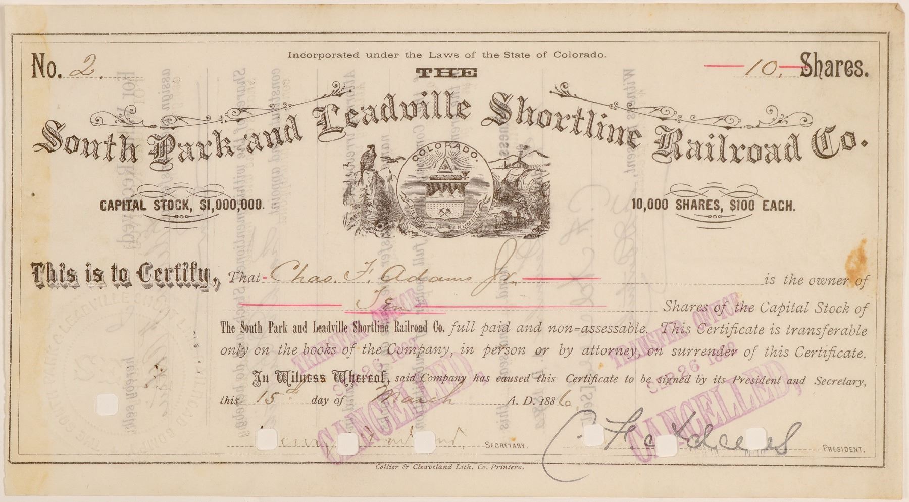Stock Certificate from the South Park and Leadville Shortline Railroad Co. Incorporated in the State of Colorado. Certificate number 2 issued in 1886 to Charles F. Adams Jr. Printed by Collier & Cleaveland Litho / Denver, Colo. Size 9 by 5 inches. In Average condition, Canceled. Incredibly rare. Cert number two! Nice vignette of an eagle, the " All seeing eye", and cabin. Signed by Chas F. Adams. According to Poors Manual of Railroads (1887), the railroad's line extended from a point on the Denver, South Park & Pacific Railroad near London Junction to the London Hill mines, a distance of 7.5 miles. Built by the London, South Park, & Leadville RR Co. with support from Union Pacific.