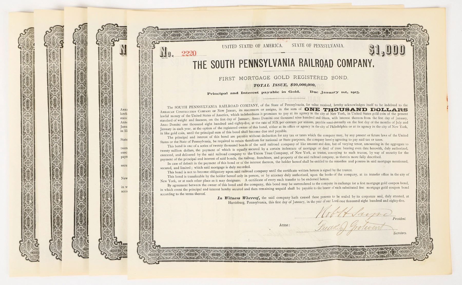 Lot of (6) numbered $1000 First Mortgage Gold Registered Bonds, issued by "The South Pennsylvania Railroad Company." These are signed, but not issued, not cancelled sheets. Embossed corporate seal at left. These all have a professional tape repair top to bottom, visible but not intrusive: text is legible and clear below. Folded about 1/3 across 12" sheet, no damage. Please see photos.