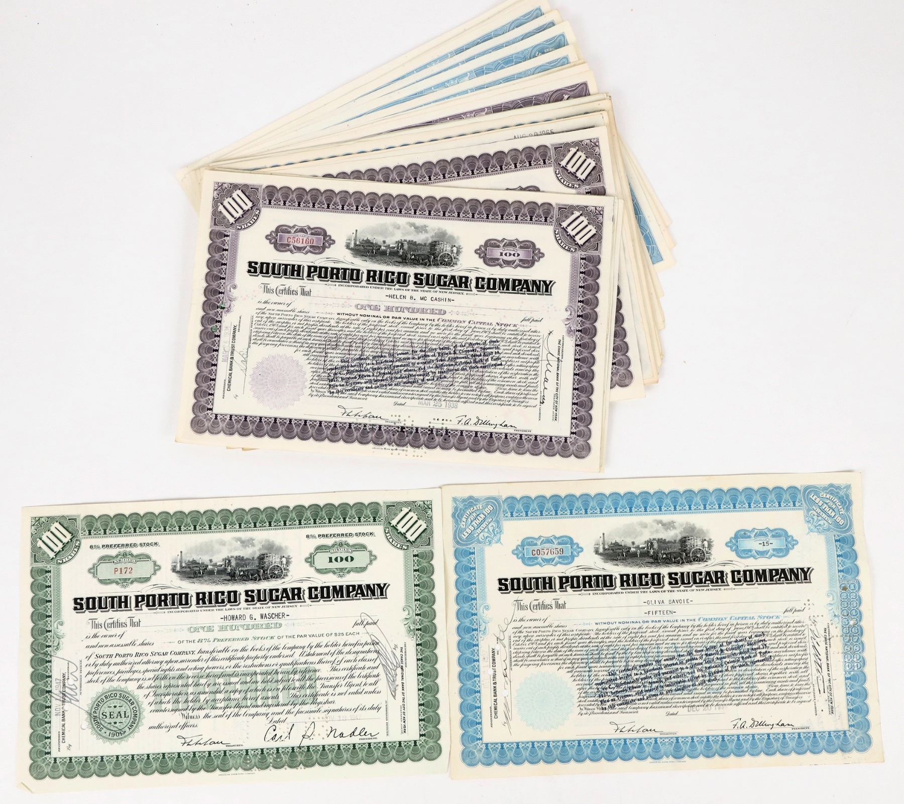 About 50 stock certificates from the South Porto Rico Sugar Company. Green ink for 100 shares, blue ink for less than 100 shares. Plantation vignette.