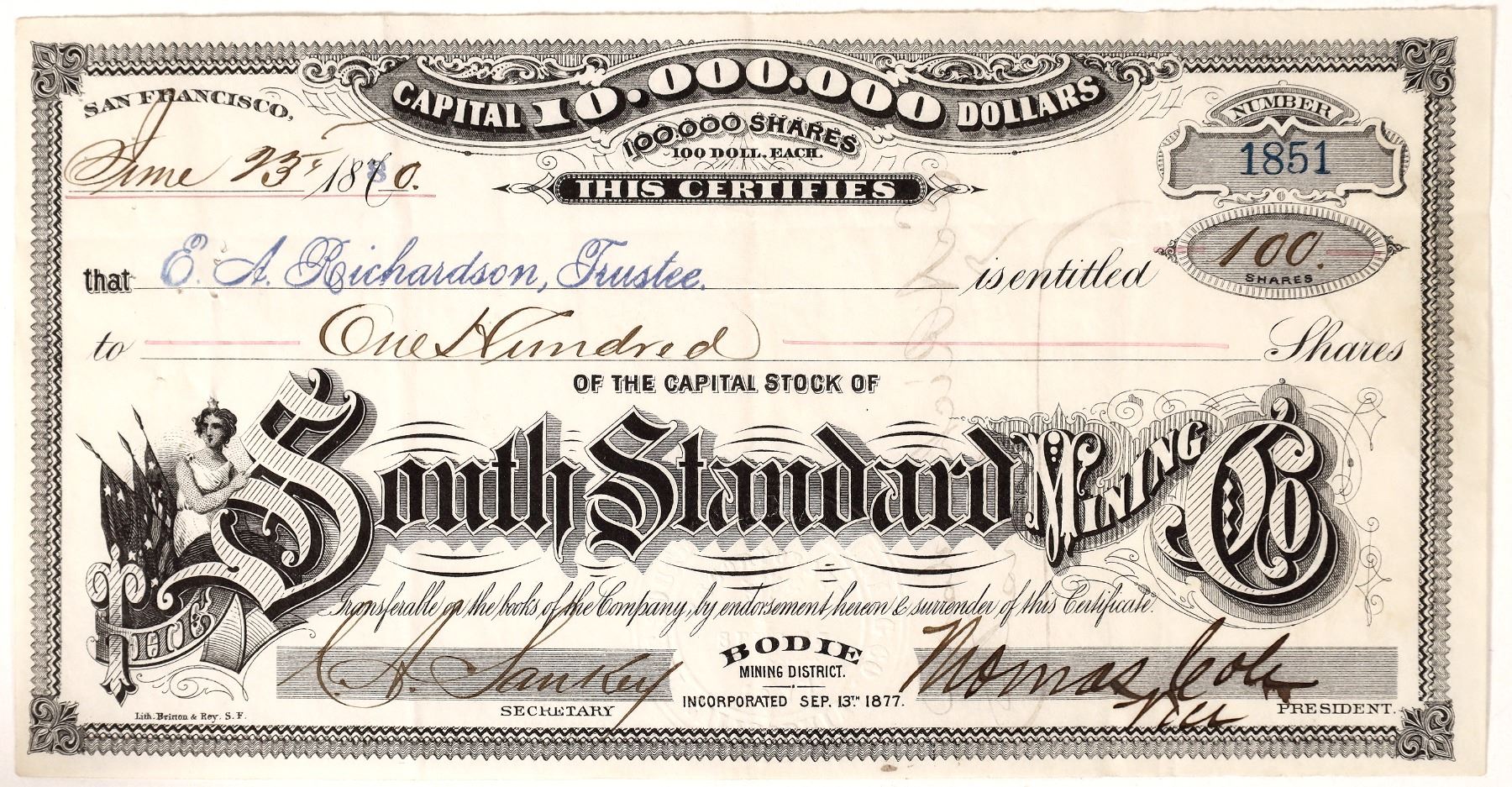 Incorporated 1877. Certificate No. 1851. Signed by secretary C. A Sankey and vice president Thomas Cole and issued to E.A. Richardson, Trustee for 100 shares in 1880. Bodie Mining District printed at the bottom. Woman with flags at bottom left. Black border. Embossed seal in the bottom center. Printed by Britton & Rey. The Standard Company produced $784,523 in gold and silver bullion during 1877 and rewarded stockholders with four consecutive monthly dividends. [Ho For Bodie]. The mine was east of the famous Standard Consolidated mine and adjacent to the Bodie and the Bulwer mines (Official map of the Bodie District, 1879 by D.V. Goodson, pub. by Lecount Bros, San Francisco. EF. Uncanceled.