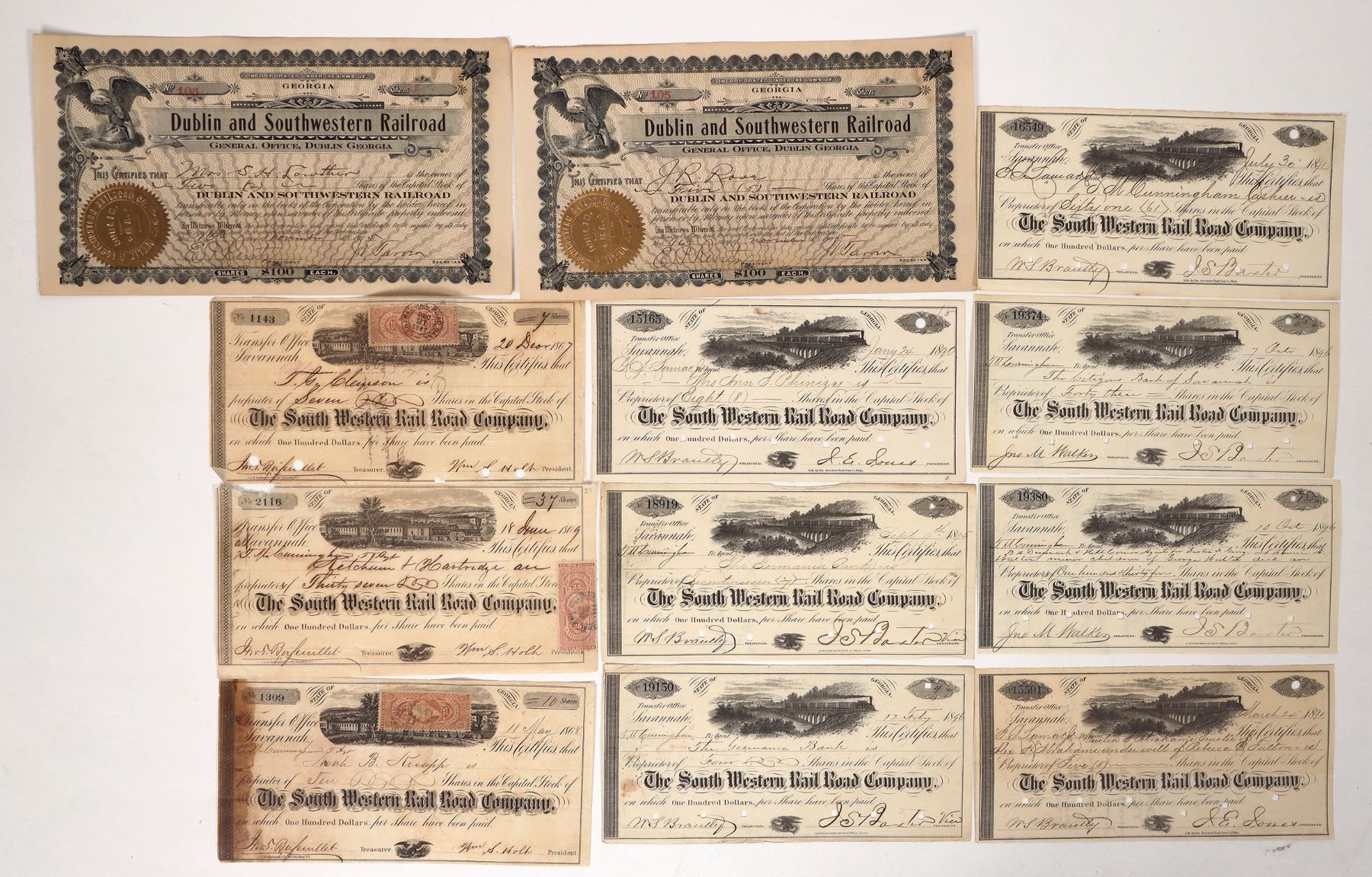 11x 1867-96 SouthWestern RR stocks in 3 styles and 1x 1905 Dublin and Southwestern.