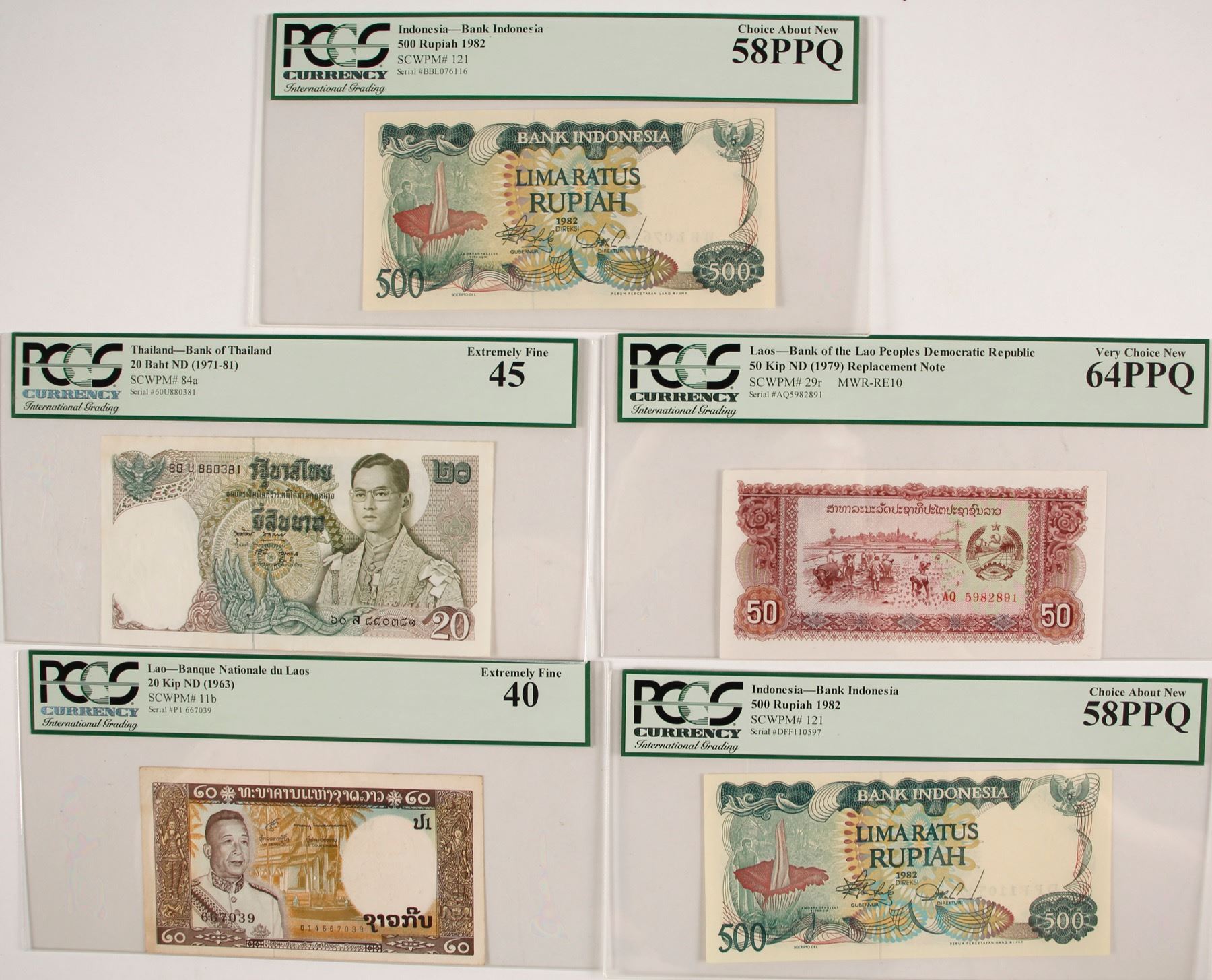 Lot of five pieces: Indonesia (2), Laos (2) and Thailand. All certified by PCGS Currency from 40 extremely fine through 64 PPQ Very Choice New. State: City: Date: HWAC# 61012