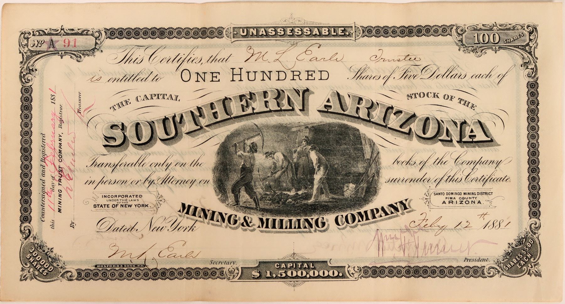Cert. #91, issued for 100 shares in 1881 to M.L. Earls, the company secretary. Inc. in New York. Mines located in the Santo Domingo district, Pima County, Arizona printed at the right. Vignette of miners working underground. It appears that the Santo Domingo Mining District was synonymous with what became known as the Montezuma District. The Arizona Sentinel in March 1879 noted that the Santo Domingo silver mines have long been worked by men too poor to properly develop them. But an Eastern company has already been formed with means enough to handle them. [Organ Pipe Cactus National Monument (N.M.), Wilderness Proposal]. The certificate is in very good condition. Uncanceled.