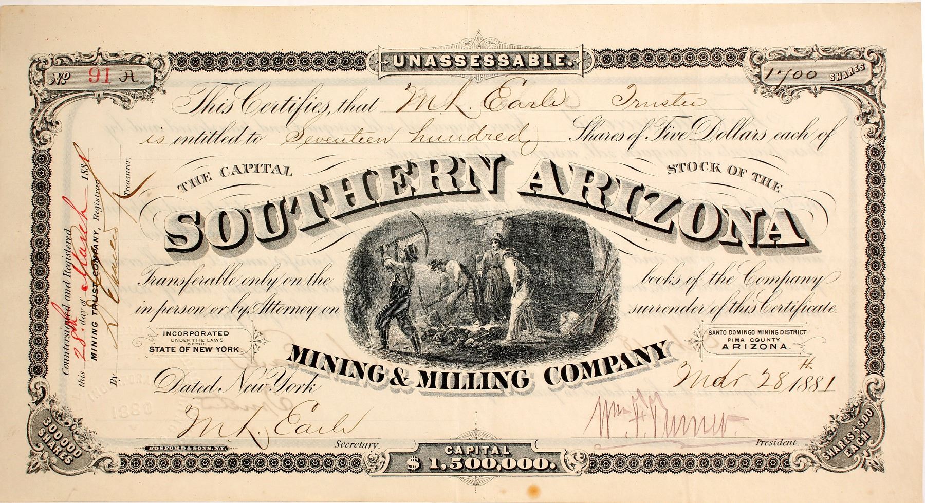 # 91 for 1700 shares to ML Earle trustee. Signed by Earle and president William F Turner. Dateline 1881 New York. Incorporated 1880. Not cancelled. Underground mining vignette. Hosford & Sons printer. Stain center bottom border. Otherwise no apparent issues. William F. Turner was the Chief Justice of the Third Judicial District in Arizona from 1864 to 1870 (Wagoner, p. 504). "It appears that the Santo Domingo Mining District was synonymous with what became known as the Montezuma District. The Arizona Sentinel in March 1879 noted that the Santo Domingo silver mines have long been worked by men too poor to properly develop them. But an Eastern company has already been formed with means enough to handle them. [Organ Pipe Cactus National Monument (N.M.), Wilderness Proposal] Prag Collection