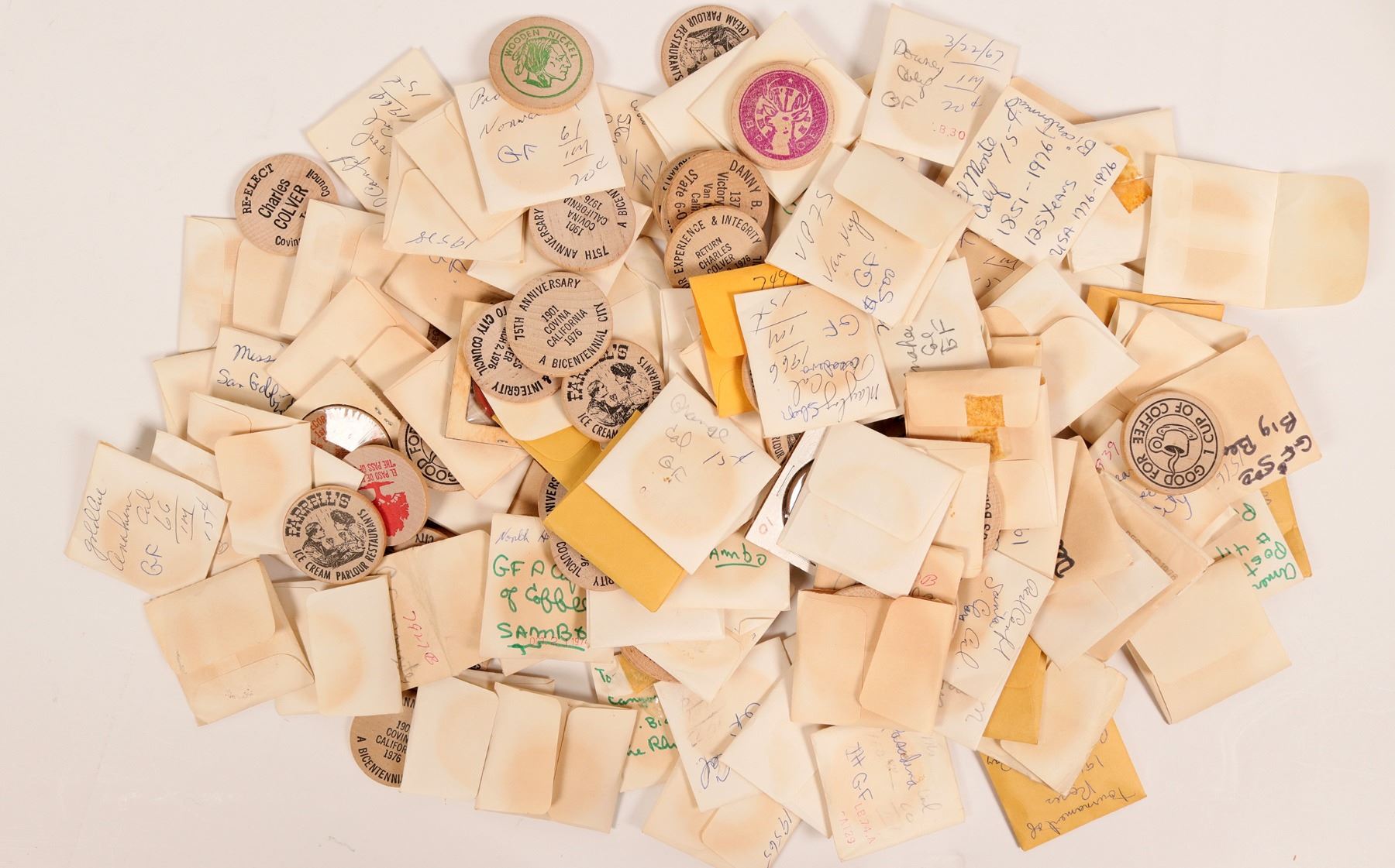 100 plus 1 1/2 to 2" rounds. Cities include: Hollywood, Covina, Pasadena, Cuca Munga, Buena Park, El Segundo, Anaheim, Canoga Park, Burbank. Example businesses: Farrell's Ice Cream, Political for Covina, Rose Parade 1968, Sambo's, Mission San Gabriel Bicentennial 1976, The Tavern Drats round TUIT Garden Grove, Los Angeles Coin Club 20 yr, Lakewood Bicentennial. Good condition