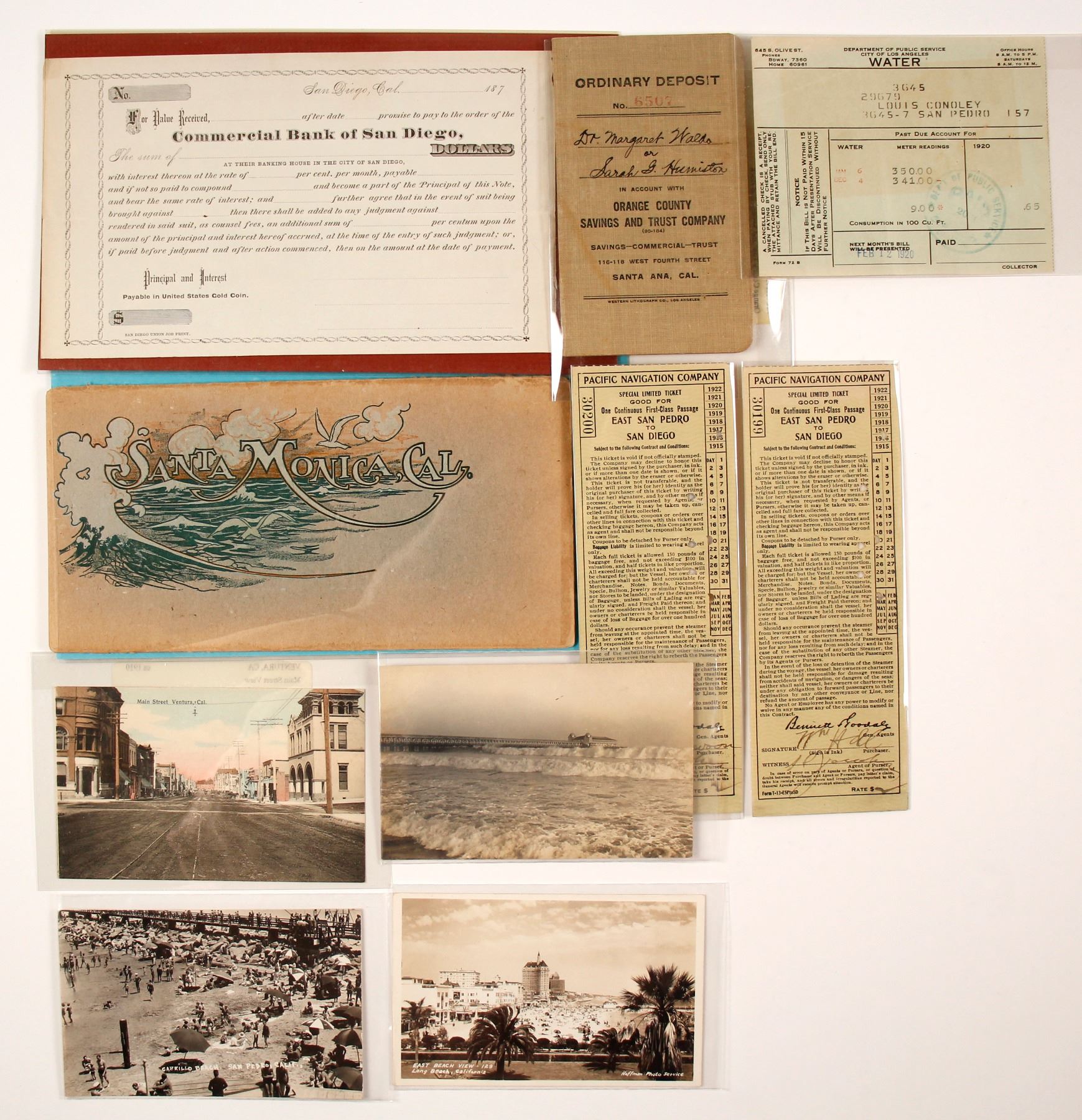 Lot of 10. 1) c.1907 tourism brochure for Santa Monica in pictorial envelope holder with many printed black-and-white photos. 2) Unused c.1870s promissory note for the Commercial Bank of San Diego. 3) Four postcards, incl. 3 real photo: East Beach View, Long Beach, CA; Cabrillo Beach, San Pedro, CA; waves and pier at Long Beach; and printed postcard of Main Street in Ventura. None were mailed. 4) Two tickets for the Pacific Navigation Co. for passage from East San Pedro to San Diego, 1916. 5) Deposit book for the Orange County Savings and Trust Co., Santa Ana. 1914. 6) City of Los Angeles water bill for man in San Pedro, 1920.
