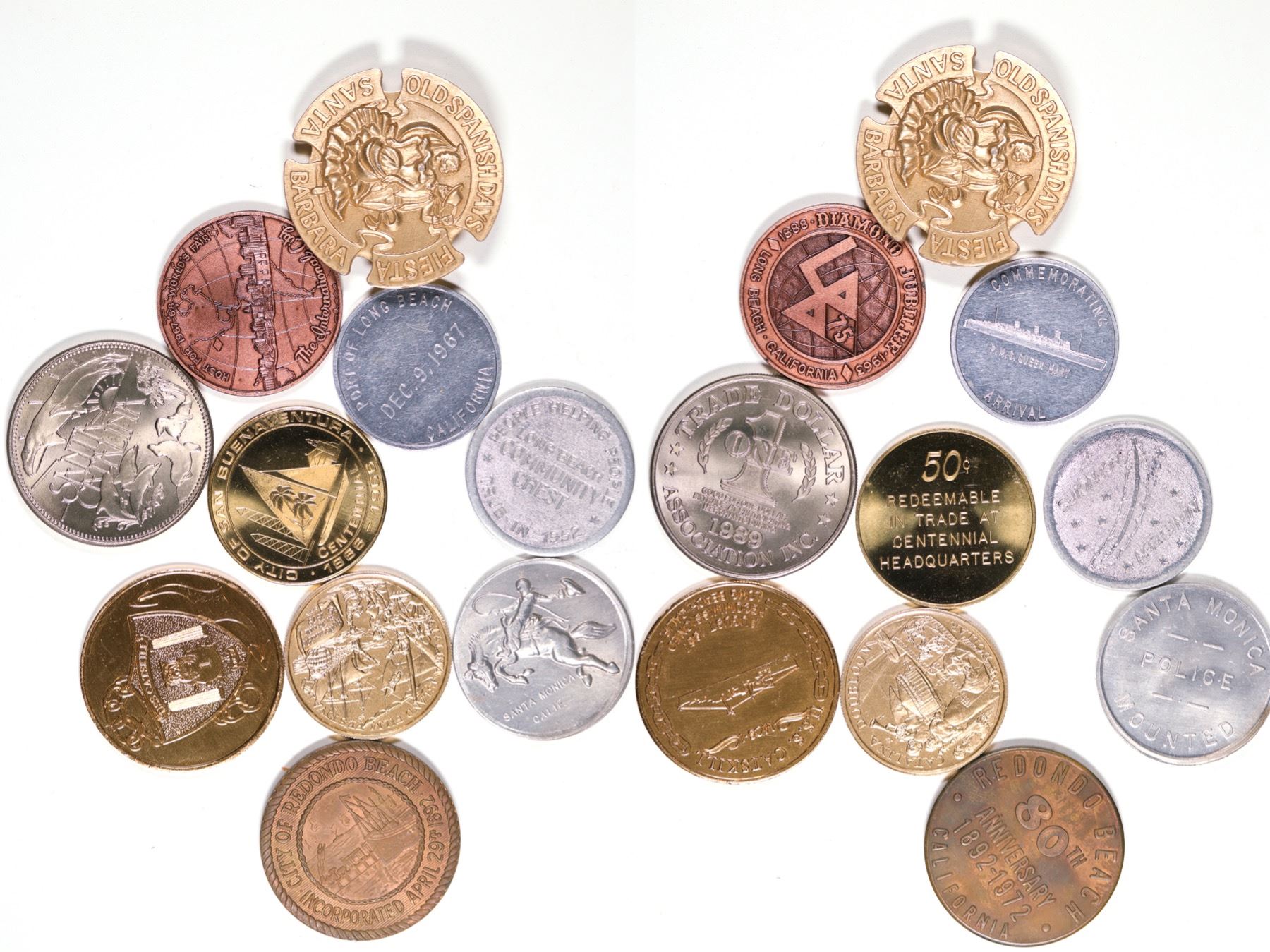 Lot of nine medals and a pin badge from the Old Spanish Fiesta Days at Santa Barbara. Medals include: 1963 Long Beach Diamond Jubilee; 1967 Queen Mary Arrival Port of Long Beach; 1972 Redondo Beach 80th Anniversary; Santa Monica Mounted Police; 1989 Santa Catalina Trade Dollar; 1952 Long Beach Community Chest; 1979 Catalina Island Film Festival; 1967 Long Beach U.S.S. Catskill launch; 1966 Ventura.