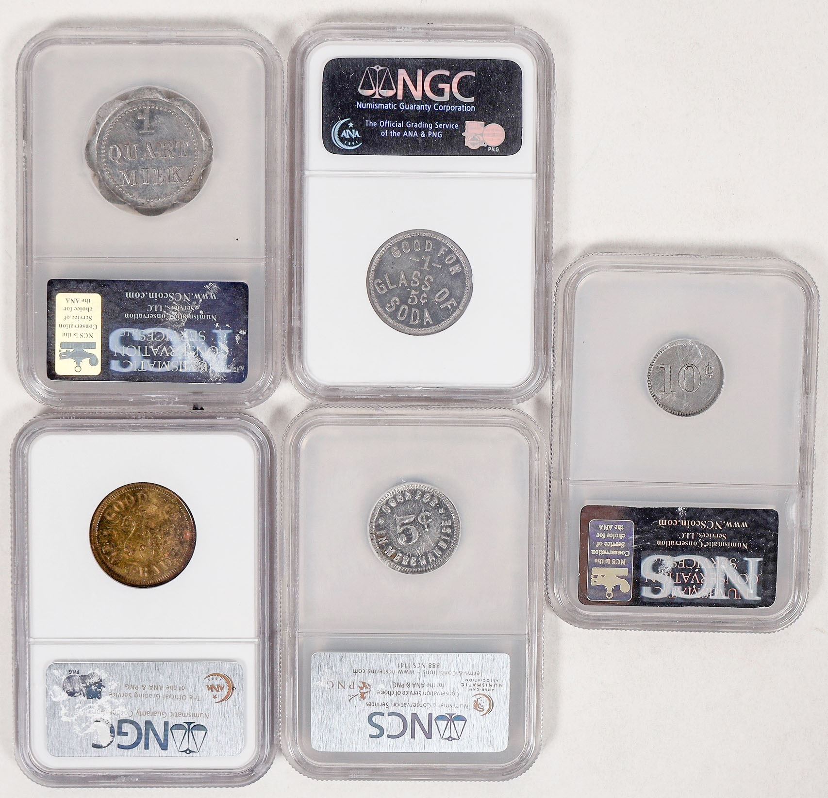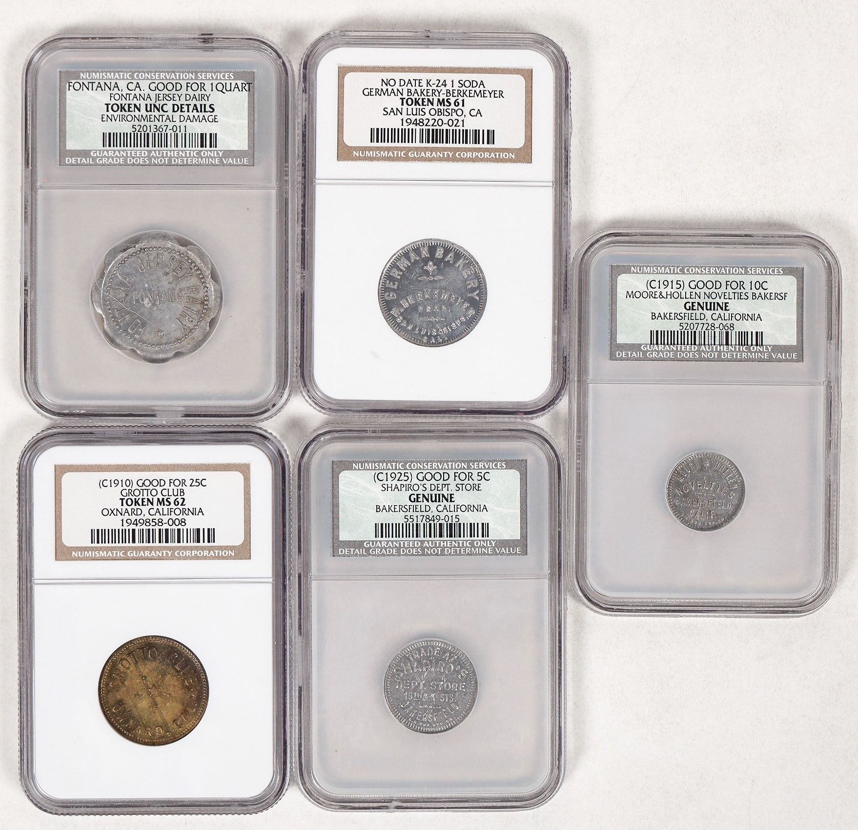 Five graded tokens from Southern California: 1) NGC MS 62: Grotto Club, Oxnard, GF 25c; 2) NGC MS 61: German Bakery, San Luis Obispo, GF 1 glass of 5 cent soda; 3) NCS Genuine: Moore & Hollen Novelties, Bakersfield, GF 10c; 4) NCS Genuine: Fontana Jersey Dairy, Fontana, GF 1 quart; 5) NCS Genuine: Shapiro's Dept. Store, Bakersfield, GF 5c.