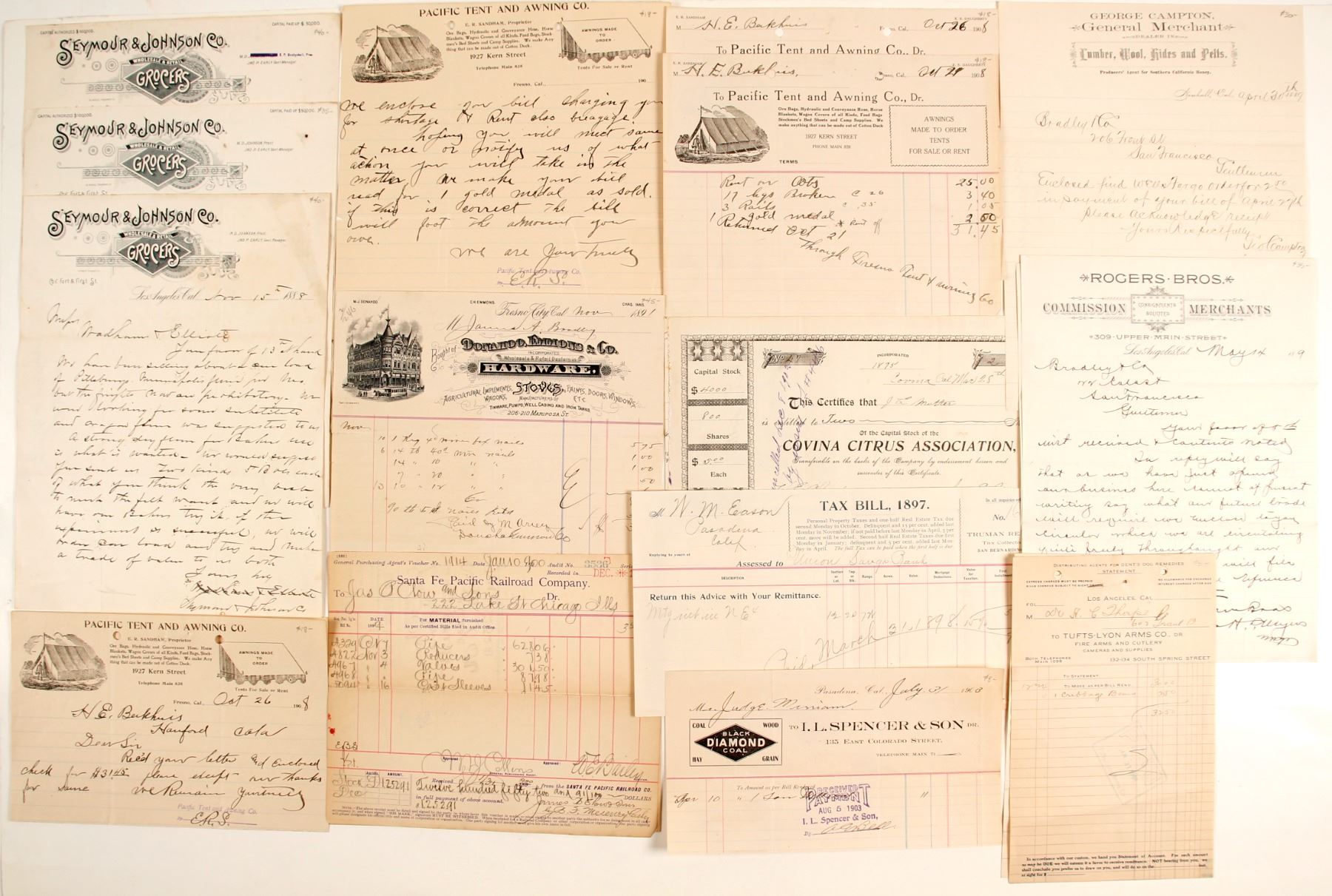 Approx. 15 items. 1897 San Bernardino Tax Bill. Pictorial billheads-Pacific Tent and Awning, Donahoo, Emmons Hardware. Letterheads from Los Angeles, Newhall, CA. Covina Citrus Assoc stock 1896.