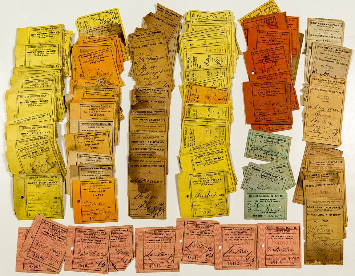 200+ ticket stubs for the Southern California Railway Company for the 1890s. Seven different types: First Class passage from Rivera, Round Trip Tickets, two different types of Half Fare Tickets, generic green stubs, 30-ride commutation ticket and 60-day commutation tickets. Six different colors. Most are 2.75" x 2.75." Soiling, punch cancellations, and many that are fragile and chipped. (Prag Collection) City: Southern California State: California Date: 1890s ID# 28825