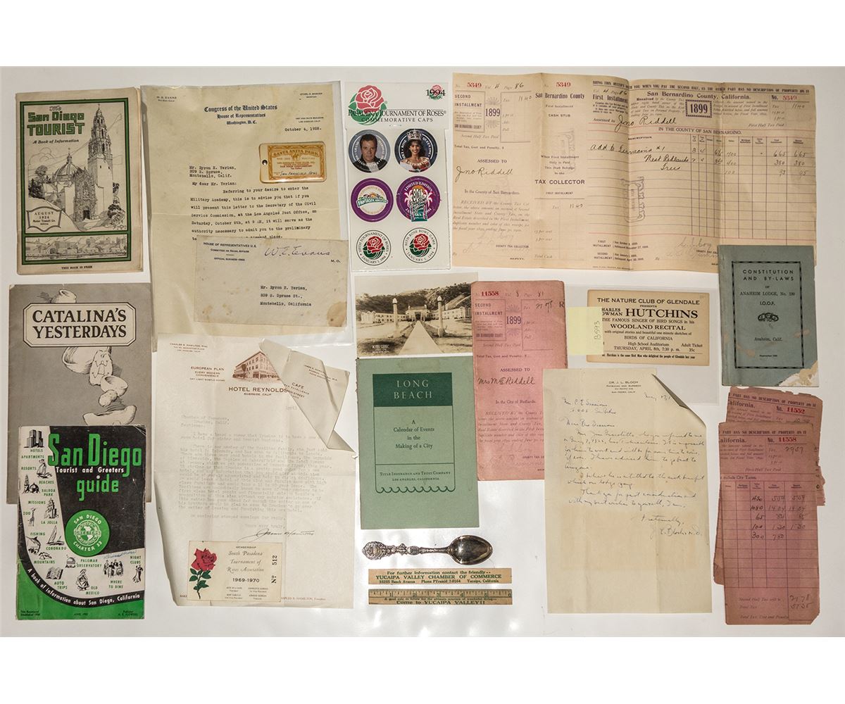 Assortment of history including brochures on Long Beach, Catalina, and San Diego (1924), a press pass to the 1948 meeting at Santa Anita Park; Rose Parade memorabilia, tax receipts, and letters. Wooden rulers from the Yucaipa Valley Chamber of Commerce, and a silver spoon from 1915 San Diego.
