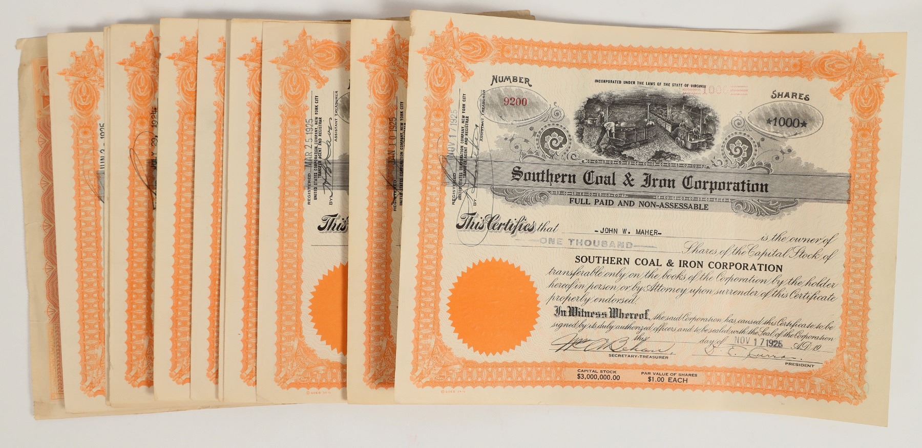 About 13 Southern Coal & Iron Corporation Stocks c. 1925. Issued. 12 are smaller format w/mining vignette dated 1925, 1 is larger format with eagle vignette, dated 1922. Incorporated in Virginia but our research suggest the primary operating location was Birmingham, Alabama. See photos.