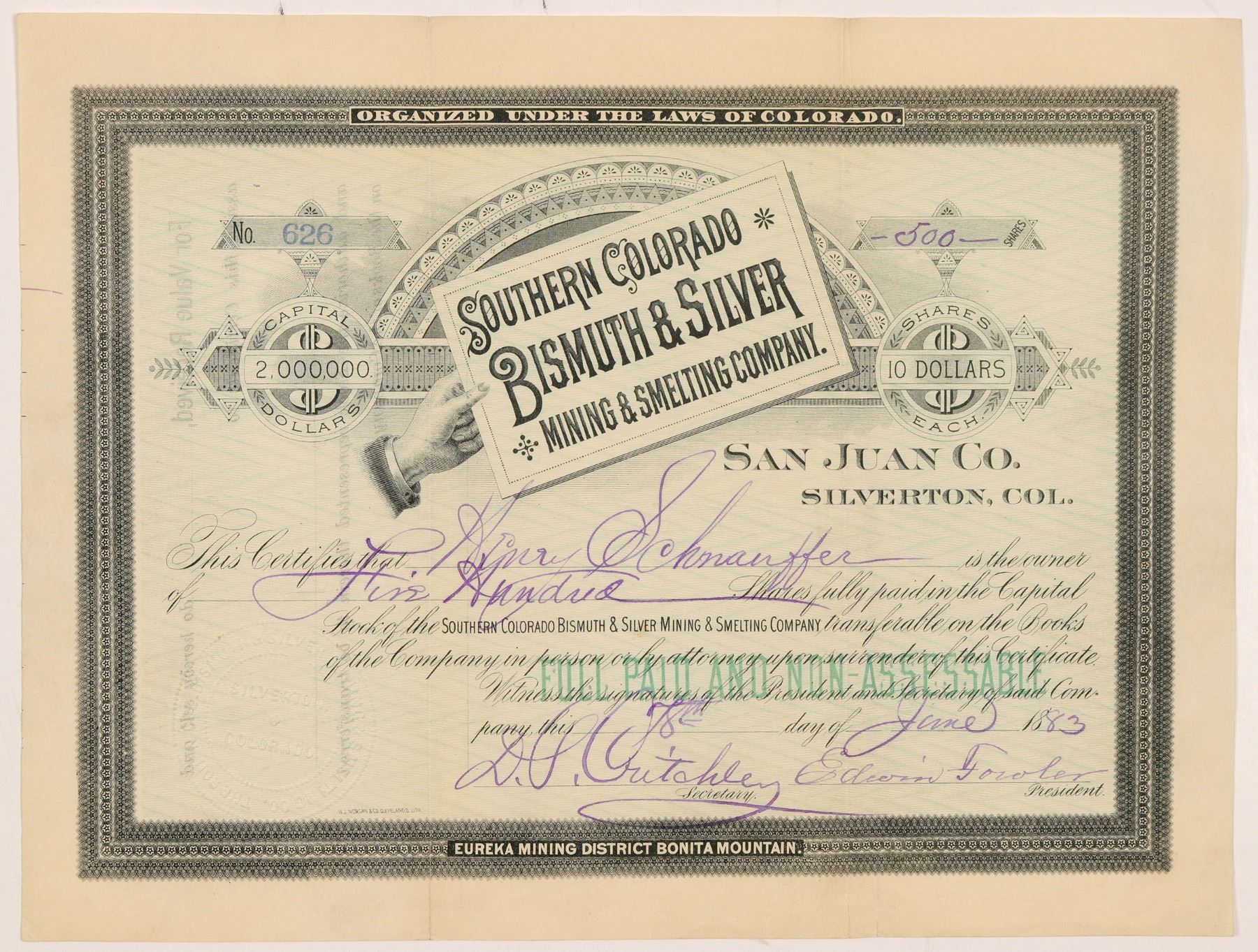 Fantastic! "Eureka Mining District, Bonita Mountain" printed at bottom center. "San Juan Co., Silverton, Col." Inc. in Colorado. No. 626, issued for 500 shares to Henry Schnairffer on June 18th, 1883. Signed by president Edwin Fowler and the secretary. Not cancelled. Interesting design with black border and print, green background, and vignette of hand holding up the company title. Printed by WJ Morgan & Co. Folds, light wear. 8 x 10.5" According to the Colorado Daily Chieftain, November 25, 1885, the company owned the Sampson gold mine and mill at Gladstone but were in financial trouble. This company not listed in C&L, but the Sampson mine is. It was situated on the south slope of Bonita Mountain, 8.5 miles from Silverton. Located in 1878 and 1881. Assays 75-300 ounces of silver per ton. [1883, pg. 669] Ken Prag Collection