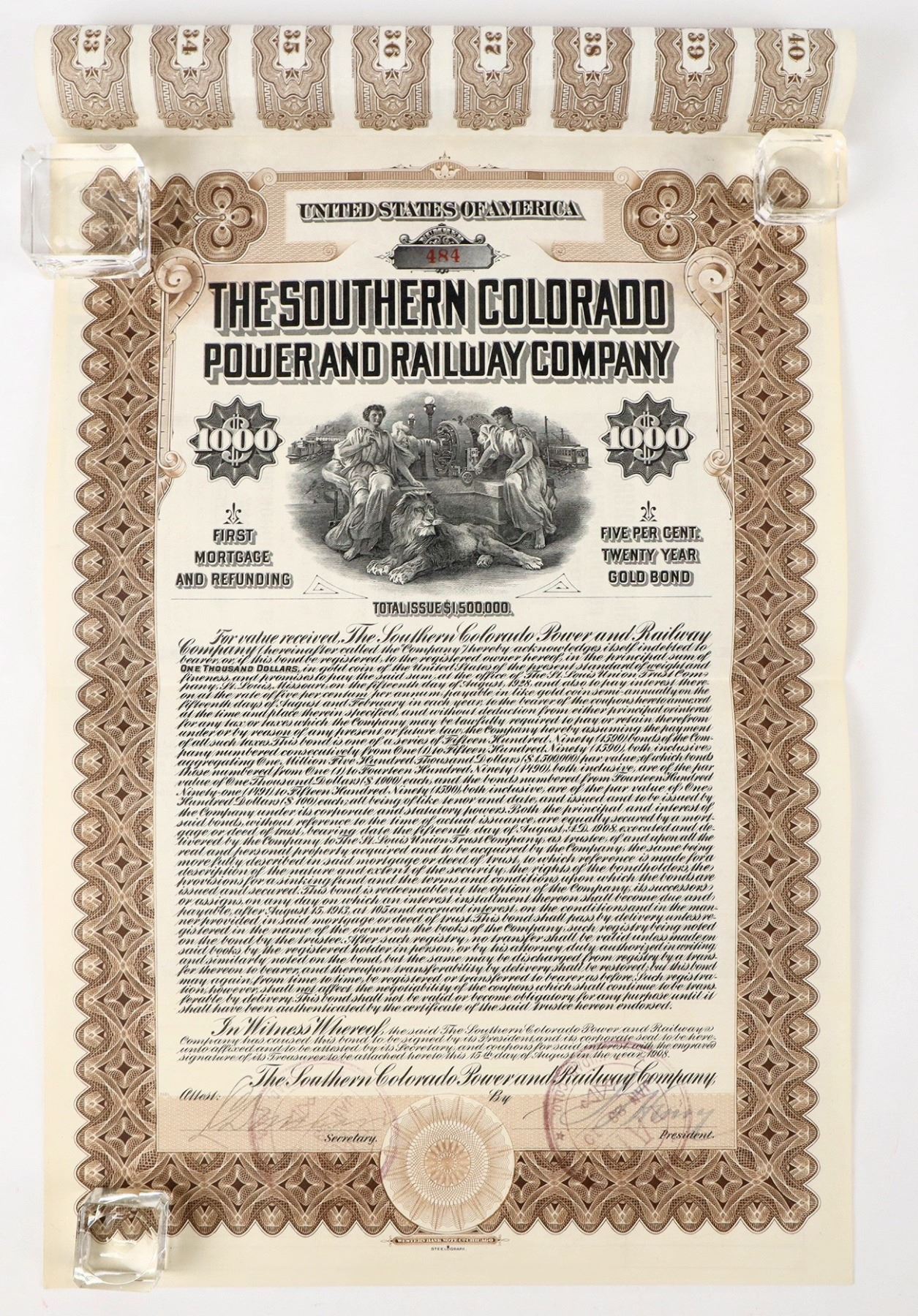 $1,000 gold bond issued in 1908, stamp cancelled. Brown border, black print, and vignette of allegorical women sitting next to a lion. Nearly full sheet of coupons attached. Electric street railway in Pueblo.