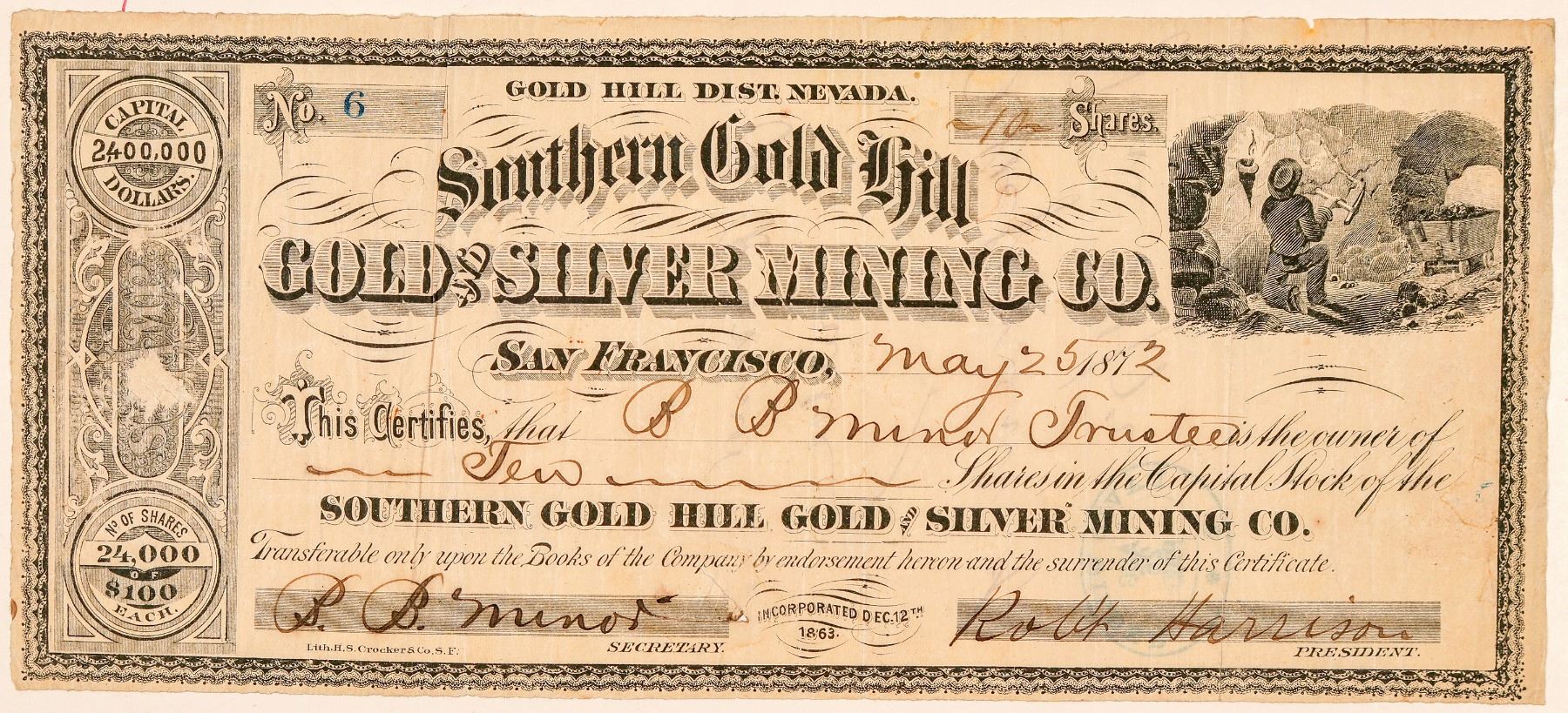 Gold Hill Dist., Nevada (printed at top center). Incorporated in 1863! Low number 6, issued for 10 shares to company secretary B.B. Minor on May 25th, 1872 in San Francisco. Signed by Minor and also president Robert Harrison. Not cancelled. Black border and print, ornate border and vignette of miner underground. Printed by HS Crocker & Co., SF. Pinholes, folds, creases, toning. Stamp missing. 4 x 9" Not listed in Annual Mining Review and Stock Ledger, 1876. Not in Filer or Holabird indexes. Incorporated before Nevada was a state. A search of CDNC turned up only stockholder meetings and notices of incorporation. Ken Prag Collection