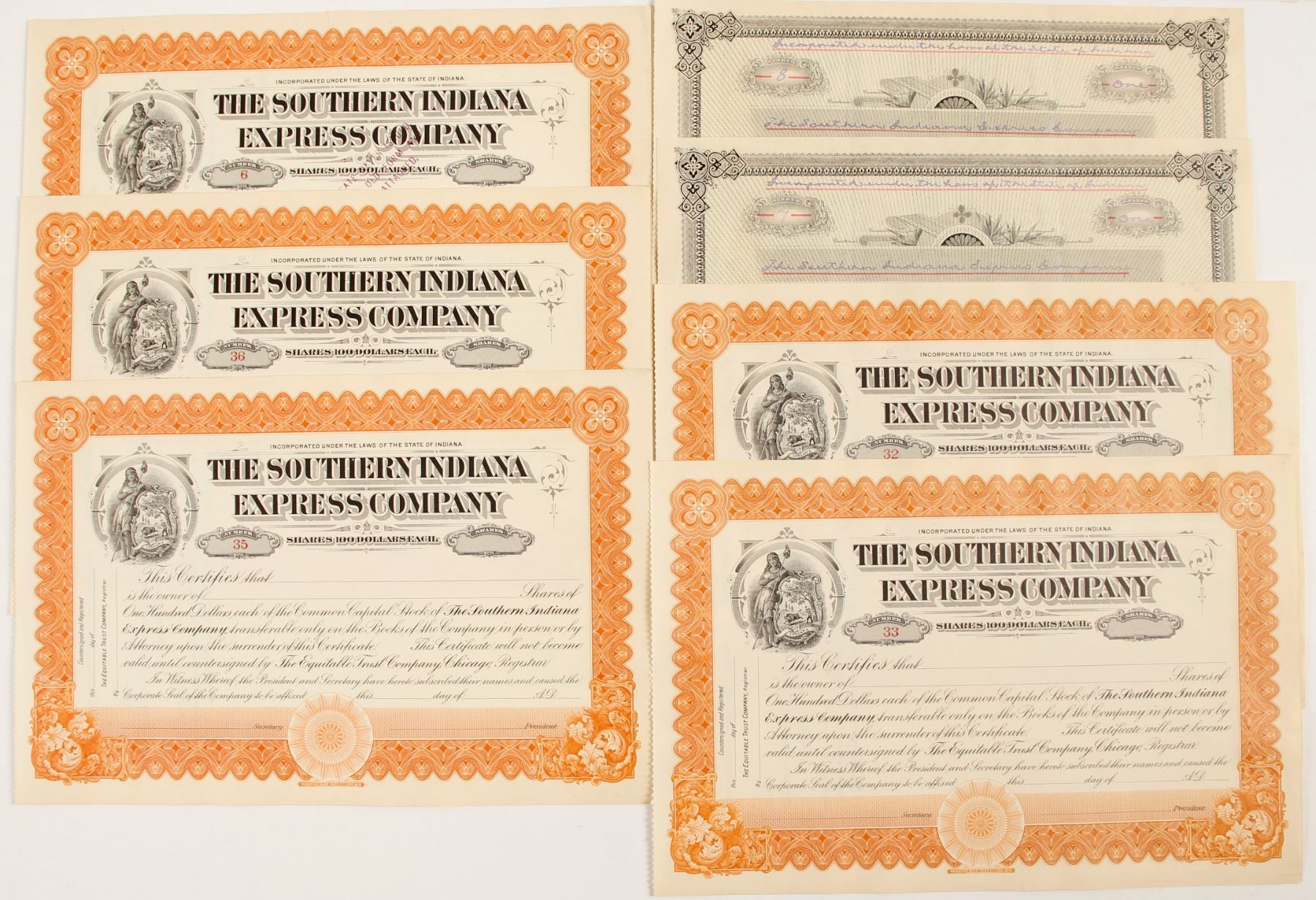 7 total certificates. Two different types. Four has orange trim and the other two are green trim with black backgrounds, both certificates are i/c. One of the orange trim certificates is canceled and not signed, the rest are unsigned and unissued. . Ken Prag Collection