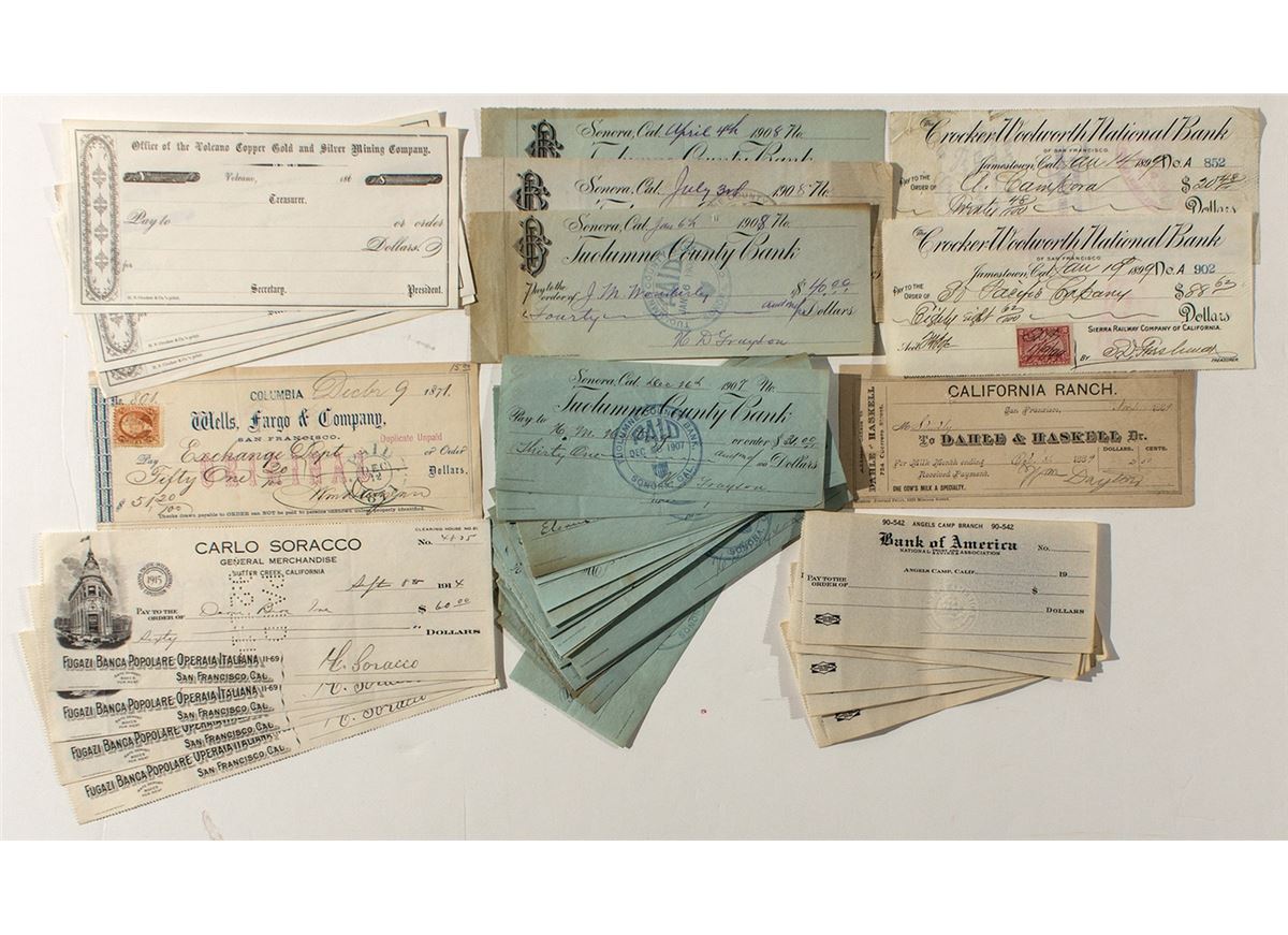 Lot of 50. Includes: Sonora (29 checks 1907-1908), Angels Camp (10 unused Bank of America checks), Jamestown (two 1899 checks w/ adhesive revenue stamps), Sutter Creek (four illustrated 1914 checks for Carlo Soracco, General Merchandise), Columbia (1871 Wells Fargo check w/ adhesive revenue), Volcano (three unused 1860s treasurer receipts for the Volcano Copper Gold and Silver Mining Co.), and San Francisco (small 1889 receipt for Dahle & Haskell, California Ranch). (Prag Collection)