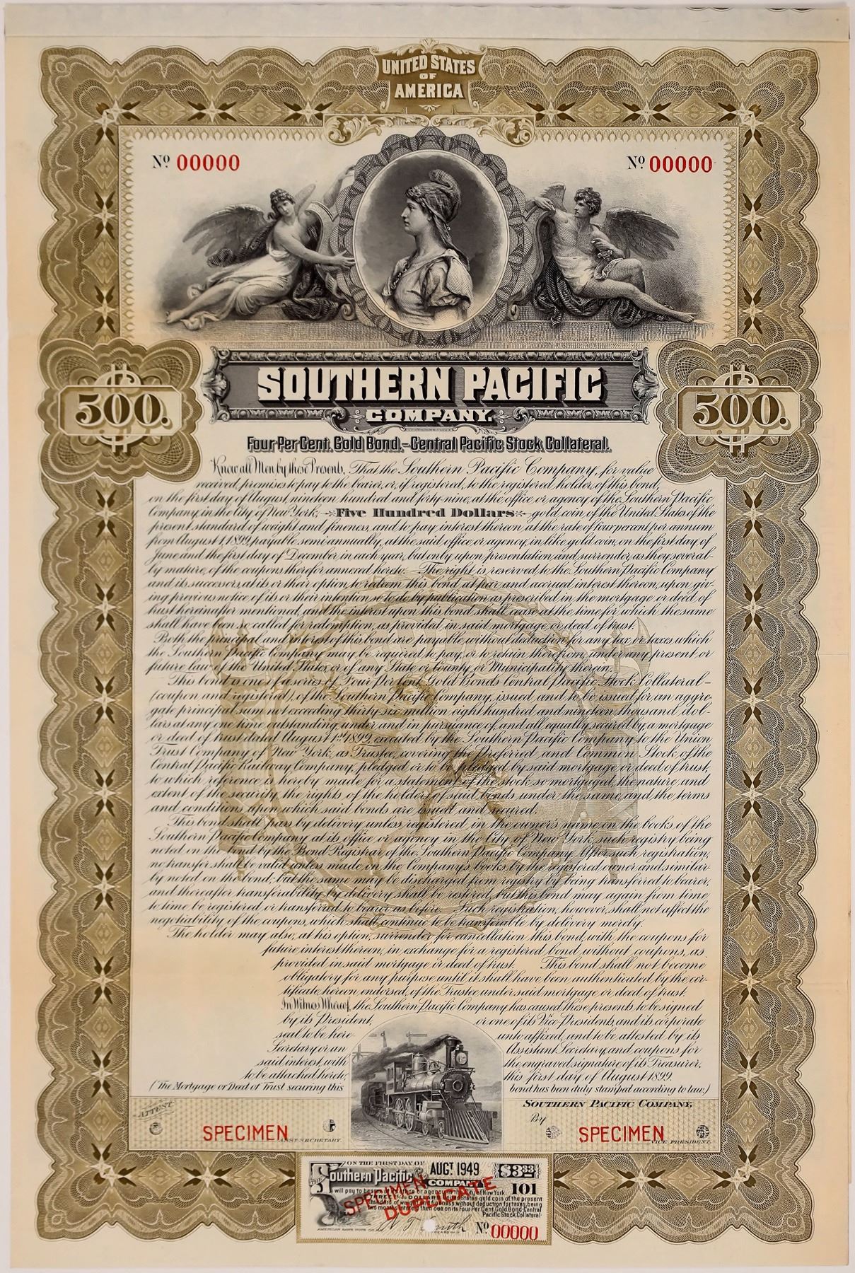 Specimen $500 bond. Gold border, black print, and two vignettes: allegorical angels around portrait, plus vignette of locomotive. Stamped Specimen over signature lines. Also stamped Duplicate. Hole punched. ABN. Sheet of 50 coupons attached. 15 x 10" Folds, toning. The Southern Pacific Railroad was founded as a land holding company in 1865, and then later acquired the Central Pacific Railroad through leasing in 1885. It was eventually merged with the Union Pacific.