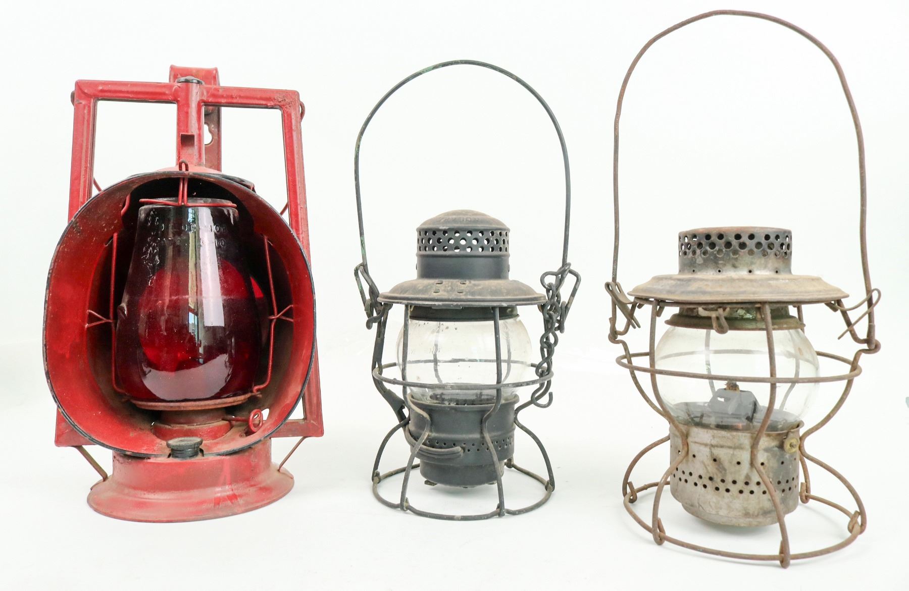 Southern Pacific Railroad company lighting fixtures, 3. Red lamp is embossed "Dietz / ACME INSPECTOR / LAMP / New York, USA" on the back and "SP.CO" on the top. Lighting shield is an oval shape, measures 8" diameter horizontally and just under 9" vertically. Overall, the red lamp measures 19" tall, including the thin folding handle. The other two lamps measure between 14-15" tall including the thin handles. The glass on all three lamps appear to be intact. Good condition, see photo.
