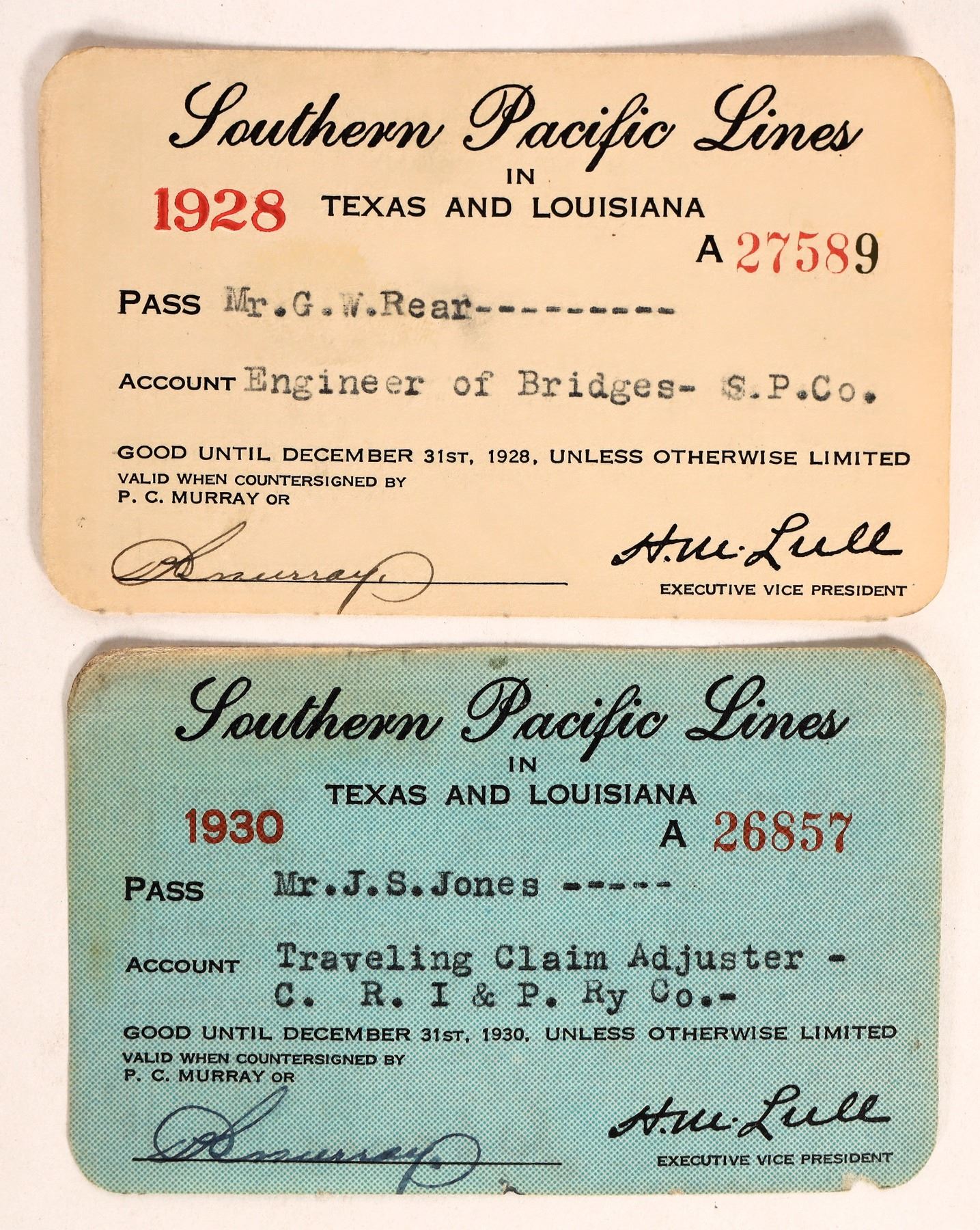 Southern Pacific Lines in Texas and Louisiana, annual passes, 1928, 1930. Issued to Mr. G. W. Rear, Mr. J. S. Jones. Printed Executive Vice President signature.
