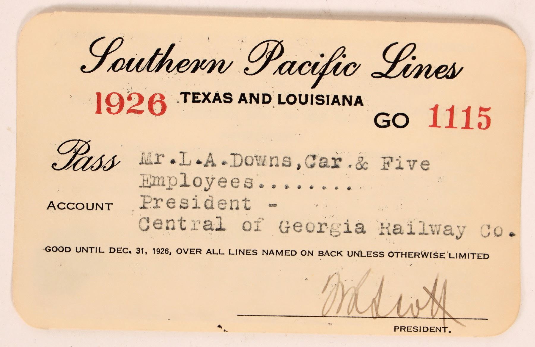 #G1115 issued 1926 to L A Downs, Pres. of Central Georgia RY Co. (signed by dons on reverse), pass signed by pres., tan card stock, red letter for year and pass number, Unk printer. Formed as part of the Southern Pacific and later merged into the Union Pacific. Ron Lerch Collection