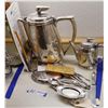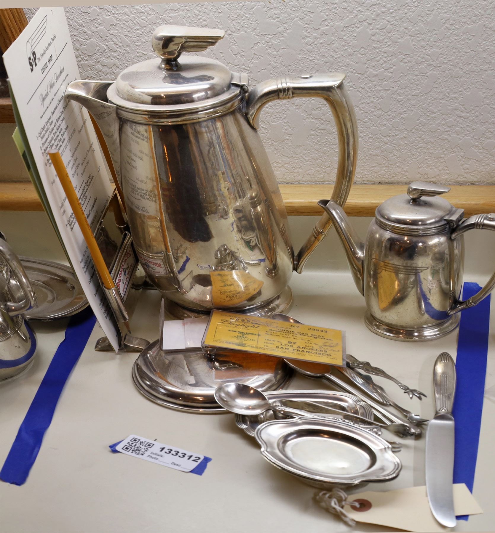 Lot of 12 Southern Pacific RR Dining Car Silver Service Items. Coffee pitcher is 9.5 inches high; creamer is 6 inches tall; butter 4.5 inches long; 2 pairs of tongs; 4 flatware pieces, and 2 others. Silver menu holder is 6 inches long and 4.5 inches tall. Includes 1946 window seat ticket from LA to San Francisco.