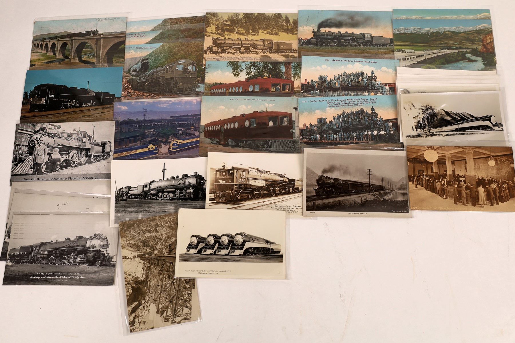 About 29 postcards (14 in color; 15 in B&W) featuring engines of Southern Pacific RR locomotives and railroad scenes. Highlights include SPRR's compound mallet engine, in which high-pressure drive cylinders exhausted their steam to low-pressure cylinders, thus multiplying the energy recovery from the steam. Also in this lot are several postcards of the beautifully streamlined Daylight locos and the McKeen motor cars, one of which has been restored and is on display at the Nevada State Railroad Museum in Carson City, Nevada.