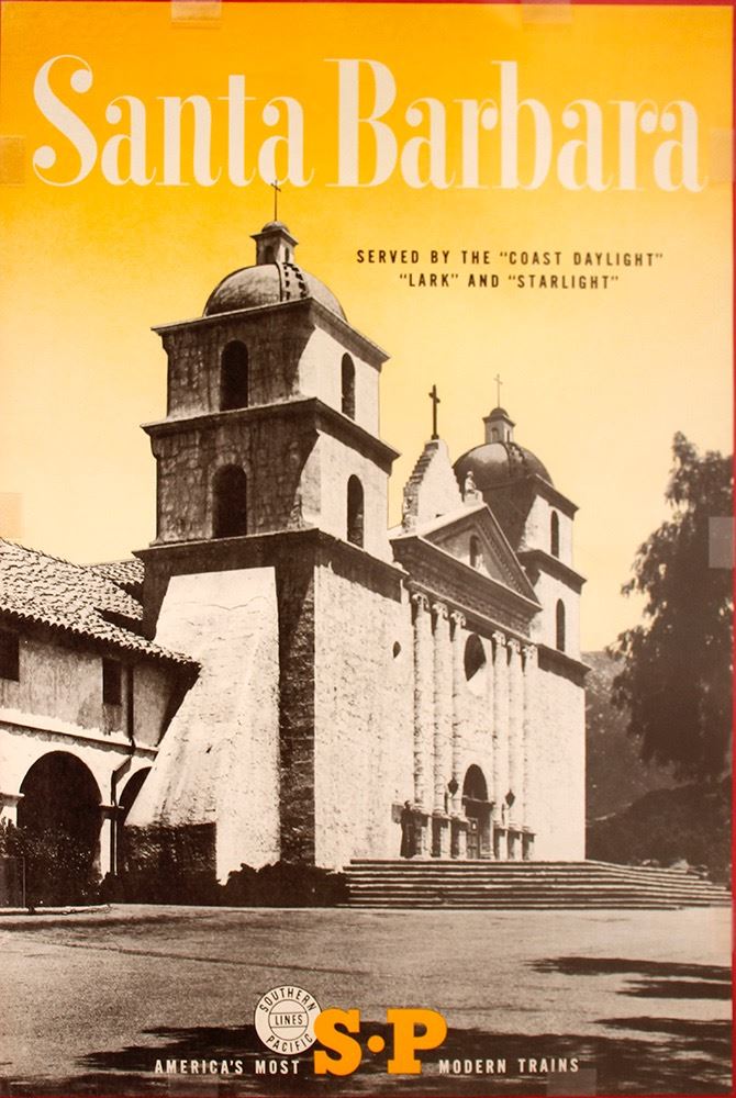 This advertisement features a black and white image of a Spanish style Mission against a yellow background. It reads "Served by the, Coast Daylight, Lark and Starlight." The advertisement measures approximately 16" x 23." (Potter Collection) HWAC# 63543 Date: Ca. 1950 Location: Santa Barbara, California