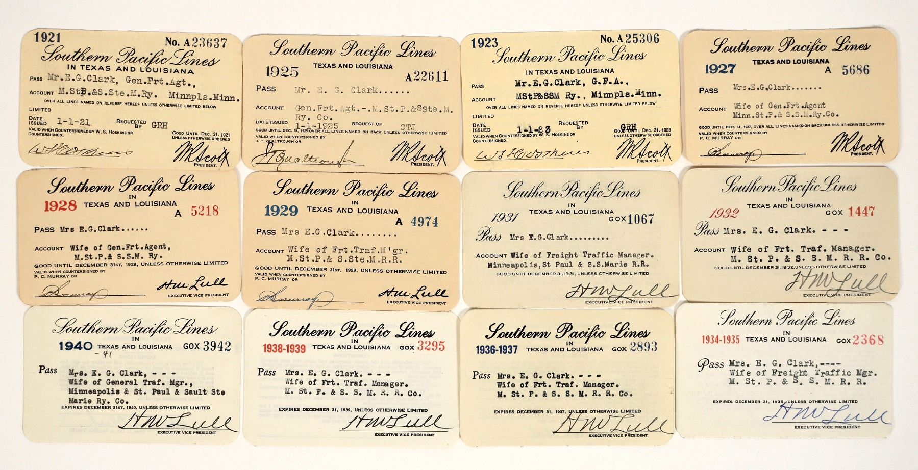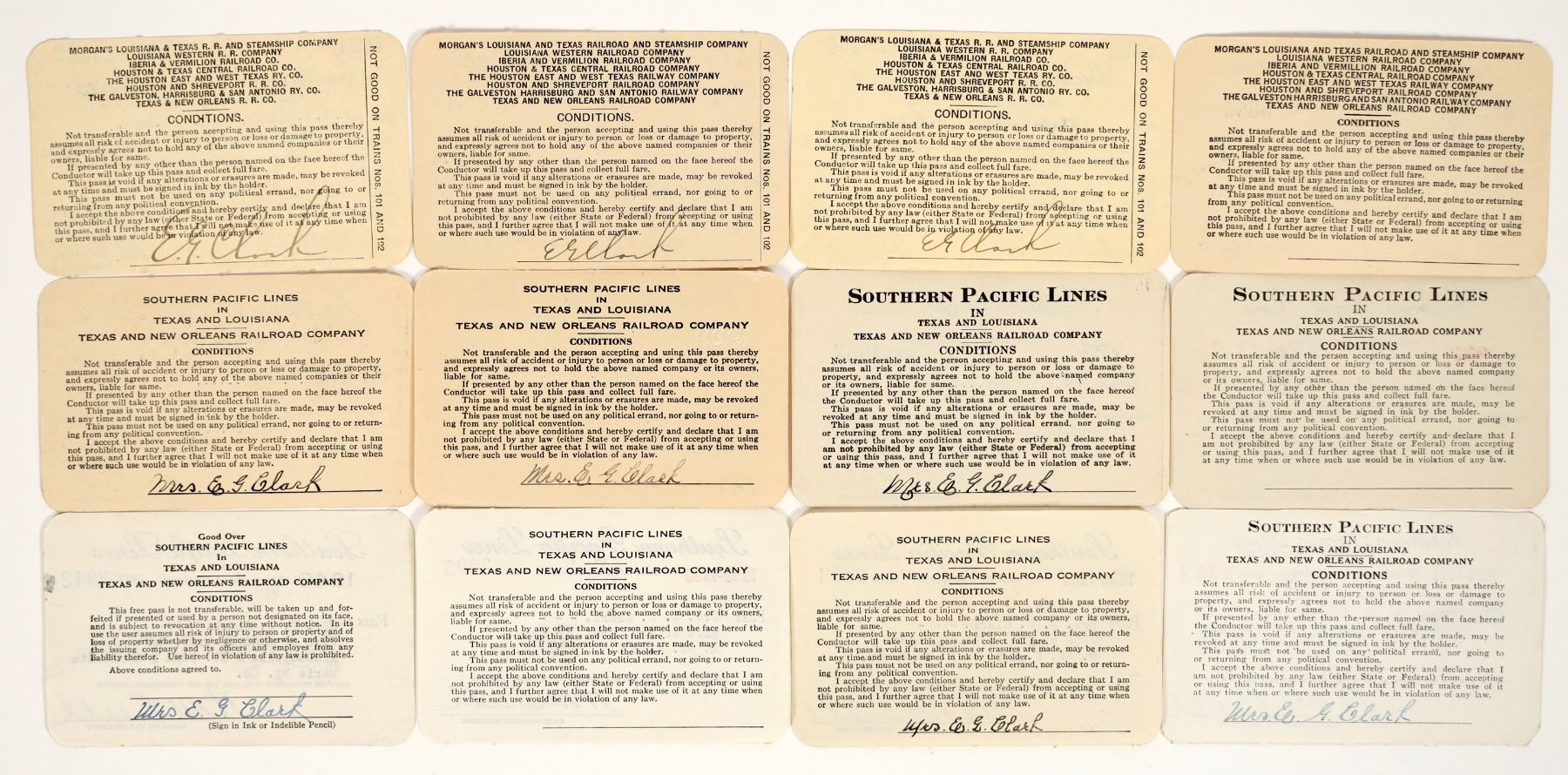 Group of 12 railroad passes from the Southern Pacific Railroad Company for Southern Pacific lines in Texas and Louisiana. Passes date from the early 1900s; see photos for specific years and additional detail.
